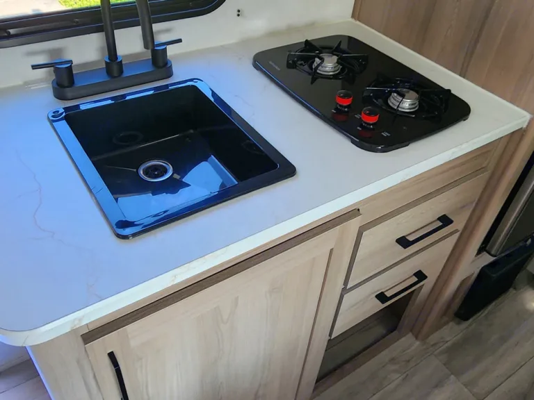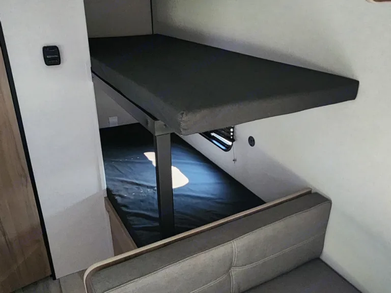 Great camper for a couple or a small family. Queen bed in front and bunks in the rear with fold down table for sleeping up to 5 people. Equiped with a 2 burner stove, microwave, fridge/freezer, toilet, shower, sink, and AC.Need to use RV disolveable toilet paperWhat's included• Plates