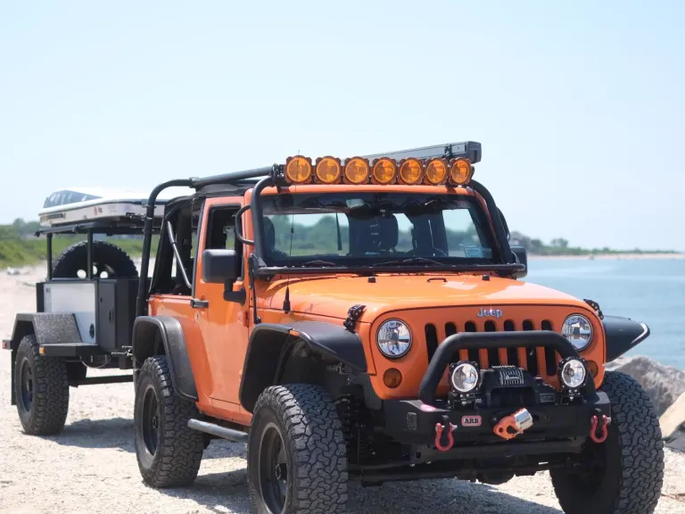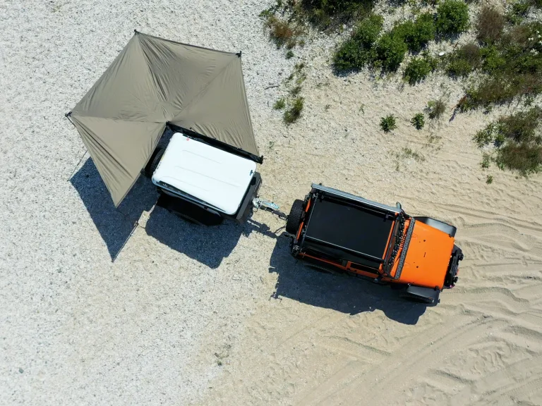 This is an expedition-quality off-road capable trailer complete with 270 degree awning, the renowned Cook Partner stove, running water (hot and cold) with an outdoor shower connection for washing down after a surf session or to shake off the mud after a hike.The cargo compartment holds a 67L 12v fridge/freezer to keep the drinks cold and no ice-meltwater on your sandwiches. There is ample room for your gear to help free up room in the vehicle. Load your scuba gear, camp gear, packrafts or inflatable paddleboards!Up top, the Dart roof top tent from South African expedition gear maker Eezi-Awn sleeps two adults on a 3"mattress. Openings on three sides provides for a great breeze on hot nights or button it all up against the worst weather. The tent sets up/breaks down in under a minute.There is plenty of lighting built in- rack lights illuminate the galley and surround the trailer. Bed lights help find gear and the rock lights under the trailer are great ambient lights. Folding solar panels are available to facilitate a completely off-grid experience.The trailer has an empty weight of just 800 pounds making it easily towable by a 2 door jeep, (like ours or other smaller rigs.) The max-coupler hitch articulates on multiple axis allowing the trailer to twist when off-camber or on uneven roads without a risk of a classic ball hitch coming undone.This rig is meant to be the ultimate support tool for vehicle-based explorations and adventures.