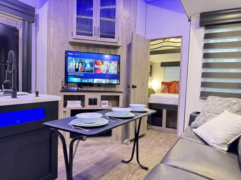 Our 5th Wheel RV has 2 bedrooms & 1.5 bathrooms. It Comfortably sleeps 6 people with the availability maybe a couple more on the theater leather recliners (if any of your guests prefer that position.)