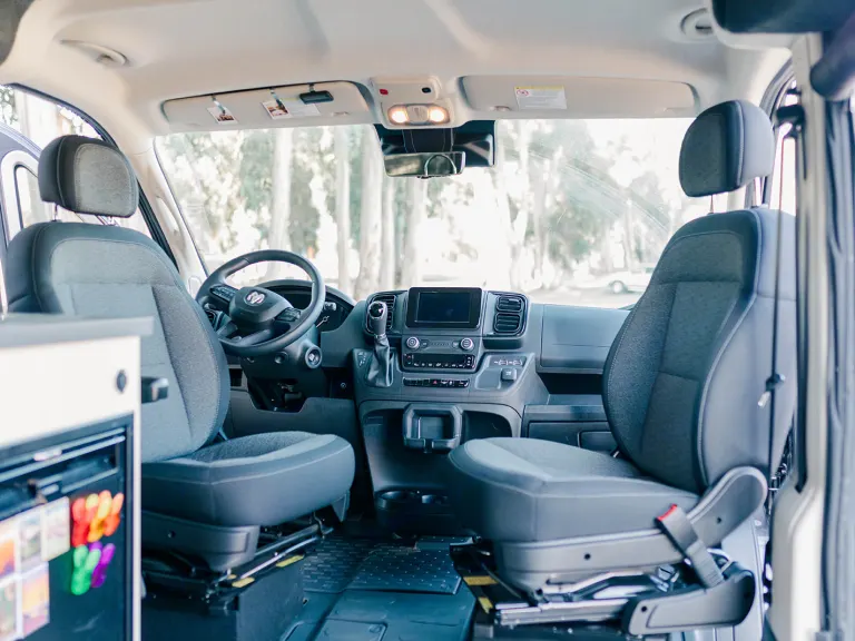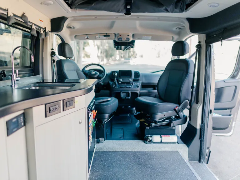 Swivel the front seats to create an indoor dining space. Open up all the screened windows to enjoy the fresh air, and at night, darken the van with all blackout windows coverings!