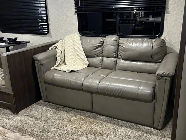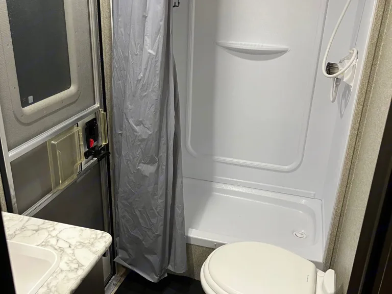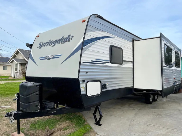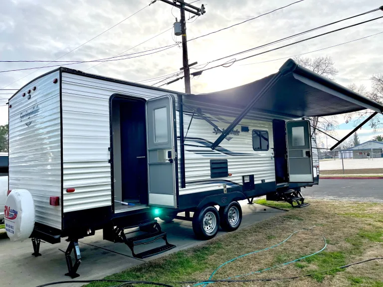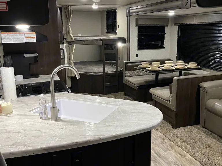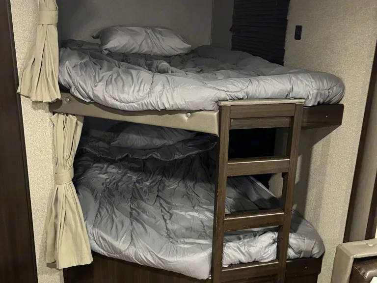 The trailer features a bunk room for the kids, with a TV and plenty of storage space to keep their toys and clothes organized. The master bedroom has a comfortable queen-sized bed with a memory foam mattress to ensure a great night's rest. The living room has a sofa that can be converted into a bed, and the dinette also converts into a bed to accommodate additional guests. The kitchen is fully equipped with a refrigerator, freezer, stove, oven, microwave, and a pantry to keep your food organized. You can also enjoy cooking outdoors on the BBQ grill while enjoying the beautiful scenery. The bathroom has a shower, toilet, and sink with plenty of storage space. Outside, you can relax under the awning and enjoy the fresh air while listening to music through the outdoor speakers. There is also a comfortable seating area with a fire pit for roasting marshmallows and making s'mores. This trailer is perfect for families who want to enjoy a comfortable and stress-free camping experience. Book today and let us help you create unforgettable memories with your loved ones!