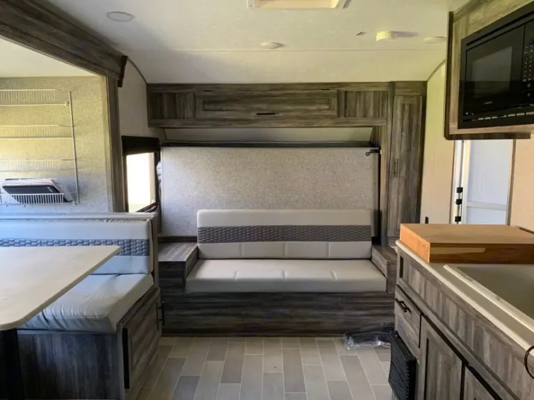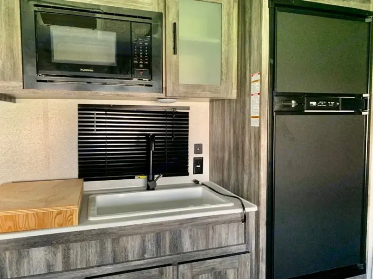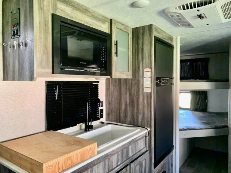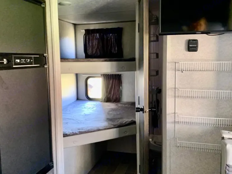 Fantastic, lightweight bunkhouse! Easy to maneuver, light weight yet with great space. This unit sports an outdoor kitchenette. Great for tailgating and camping. Inside, it can sleep 2 adults plus 6 children or 4 grown adults in individual beds. It has a shower and toilet inside as well as an outdoor shower.Delivery is available within 100 miles for a fixed price ($300). Generators, load distribution hitch and kayaks are available for additional fees. Black and grey water dump is part of prep and service. Therefore, you dont have to stop anywhere at end of your trip.What's includedCoffee pot, crock pot, microwave, fridge, two burner stove top, kitchen ware, 2 camping chairs, outdoor griddle, and outdoor mini fridge.Other things to noteStandard size black, grey, and fresh water tanksNo Smoking