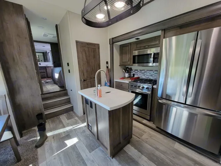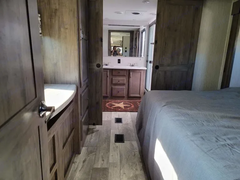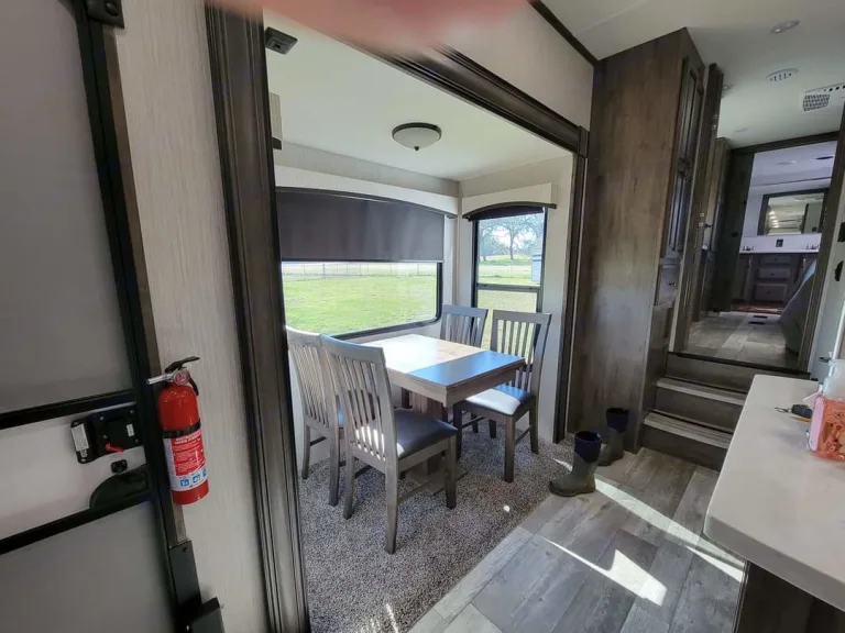 Front Living Rear Bath with Delivery Available!Large open living space offers plenty of room for the entire family. Relax and watch tv (60" TV in the living area) with dual recliners. Residential fridge / freezer with enough room for all your groceries in one trip. Great out door kitchen with small gas grill and a small sink. This like-new trailer has a large 20' awning, LED awning and cap lights , and outdoor speakers for amazing outdoor comfort while hanging at the campground. Dual air conditioner units to stay cool even on the hottest ( and humid Texas !) summer days. Five slide rooms provide enough space for a massive dual vanity sink, king bed, and walk in shower with a seat. If you plan on having company, fold out the opposing hide-a-beds in the front living space. The additional half-bathroom off of the kitchen is a great accommodation for guests! An outside kitchen, massive rear storage, and sliding storage tray make this camper extremely usable for all.What's includedWe do not charge extra for the essentials!!