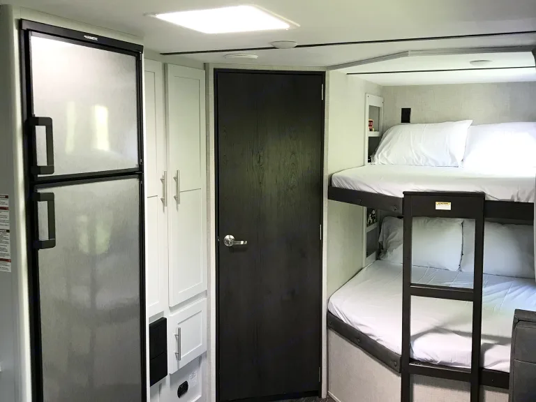 I am pretty much a “clean freak” and this passed with flying colors!! Our stay was so enjoyable because of how clean the trailer was! The queen bed was really comfortable too. Very fun trip! Will reserve again!