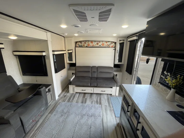 Hit the road in style and comfort with our brand new 2025 Jayco Jay Feather 19MRK travel trailer!Surprisingly Spacious Interior: Enjoy a surprisingly roomy living space with a Murphy bed that converts to a comfortable (upgraded) RV queen-size bed, two reclining theatre seats, and a fully-equipped kitchen.Modern Amenities & Conveniences: Stay entertained with a smart 40" flat-screen TV, and enjoy the convenience of a microwave, 11cu inch 12v refrigerator & freezer, 13,500 BTU Coleman Mach Quiet Series A/C, 35,000 BTU furnace, built-in fireplace, on-demand tankless water heater, and three-burner cook-top and stove. Also added for your safety, a rear back-up camera and two side marker cameras for driving and parking! Camp comfortably in various weather conditions thanks to the Climate Shield zero-degree tested weather protection.Outdoor Living: Relax under the 15' awning and enjoy the fresh air. An LP Quick Connect lets you easily hook up your grill for outdoor cooking. Two folding chairs and outdoor mat included.Lightweight and Easy to Tow: With its aerodynamic design and lightweight construction, the Jay Feather 19MRK can be towed by a variety of vehicles.What's includedWe include everything you should need other than food & drinks, just like a hotel or Airbnb. This includes all the silverware/dishes/cups/cooking utensils for the kitchen, and coffee maker (with filters included) and hot-water kettle, and linens and pillows for sleeping and bathroom essentials including towels and hand soap. Please note: we do not stock it with body wash, shampoos or conditioners as some folks may have skin concerns, so please bring your own.Recommendations• Zion: Red cliffs, slot canyons, epic hikes