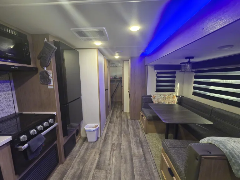Experience the great outdoors with our cozy camper trailer, perfectly setup for everything you need to go camping. This inviting setup features all the comforts of home but in a home away from home creating an ideal space for relaxation and socializing. Whether you're enjoying a morning coffee or sharing stories under the stars, this camper trailer is your gateway to unforgettable adventures. Our rental comes with everything needed, all you have to do is bring yourself and a delicious meal. Camper comes stocked with a welcome package on all rentals. What's included• Linens