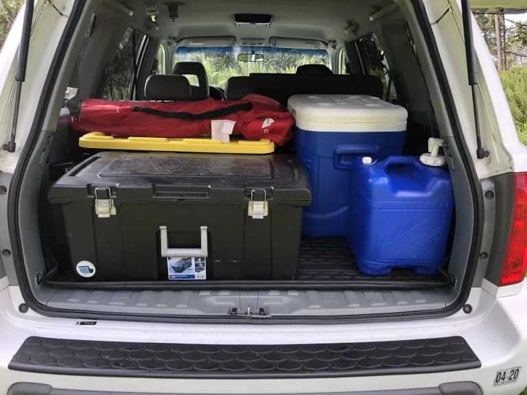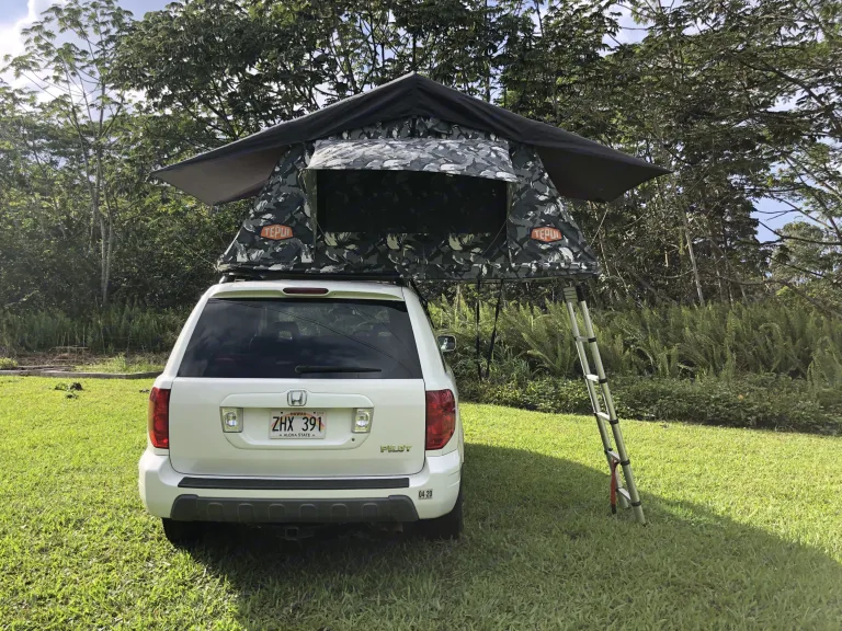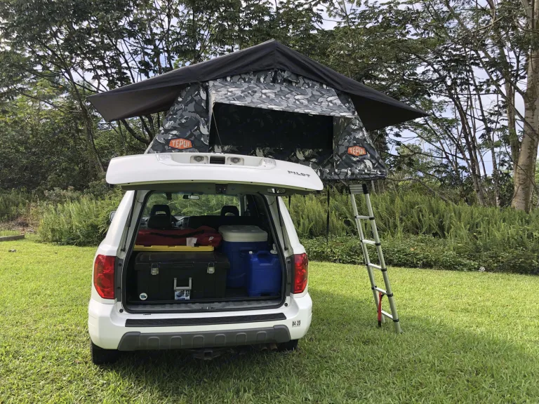 This roomy 4wd SUV provides everything you need to get to all the sweet camping spots around the Big Island! The Honda Pilot is roomy, comfortable, good on gas, yet rugged enough to get you where you need to go! Plenty of power, and great if you want a bit more interior room to secure your belongings. You can comfortably carry 5 adults in this rig!Free pickup and Drop off at Hilo International Airport & pickup service available at Kona International Airport for a nominal fee! Select pickup or drop off in the add on's section when you book!Explore the Big Island of Hawaii on your own terms with one of our go-anywhere trucks, outfitted with Tepui roof top tents and all the camping gear necessary to mount your own expedition into our unique island paradise! We offer a unique alternative to the usual car+hotel package, where you spend as much time driving to the sights, as you do seeing them. With our vehicle and tent package, you pick a starting point and then keep going on your own self-guided tour! With over a dozen public and private campgrounds scattered evenly around the island, you will easily be able to explore every part of this lovely island.All vehicles come fully outfitted with the following items packed in plastic waterproof tubs:Camp Kitchen Kit