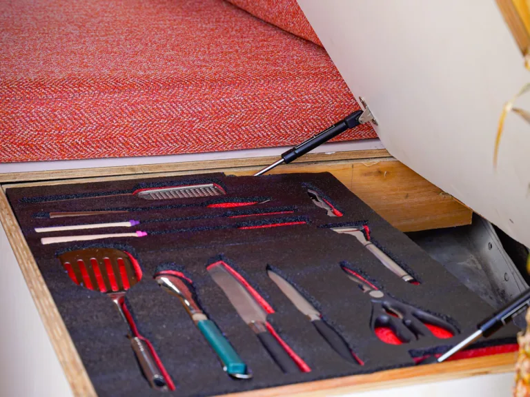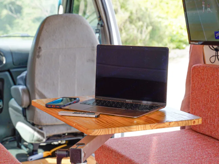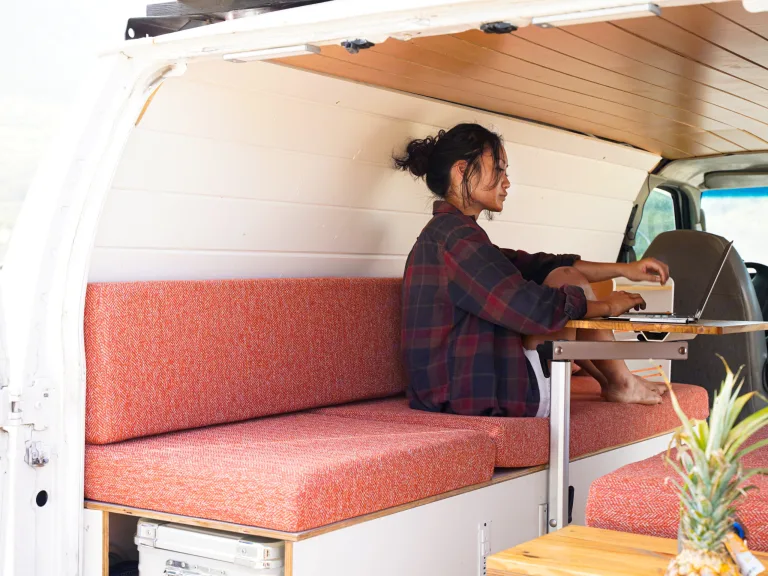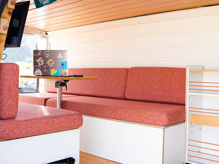 Andy features a rooftop tent upstairs for sleeping, giving you a cozy and elevated place to rest at night, while downstairs you’ll find a dedicated lounge area where you can work on your laptop, relax, eat, or unwind after a full day of exploring. It’s the perfect balance of adventure and comfort.