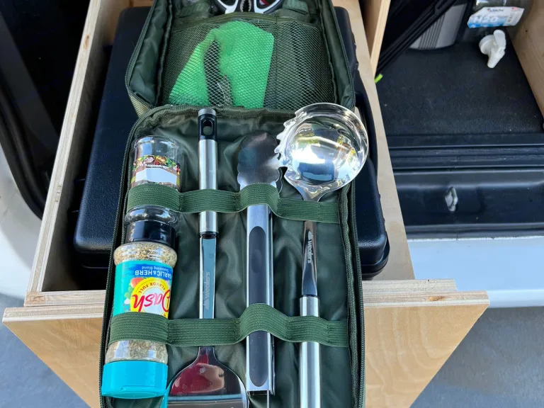 This van comes with a 4” memory foam full size bed that's cozy for bed time. You’ll also find a Yeti cooler and mugs so you can have cold drinks at the beach and hot coffee in the morning.