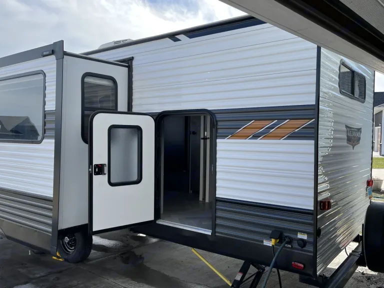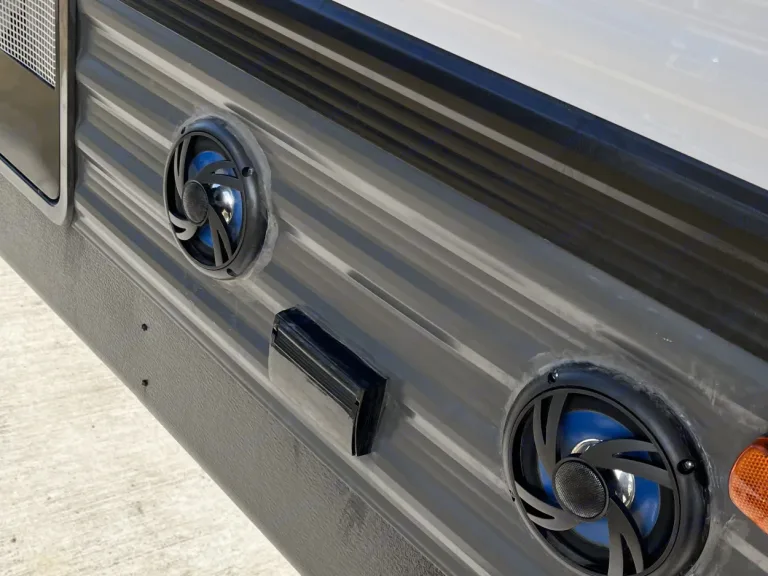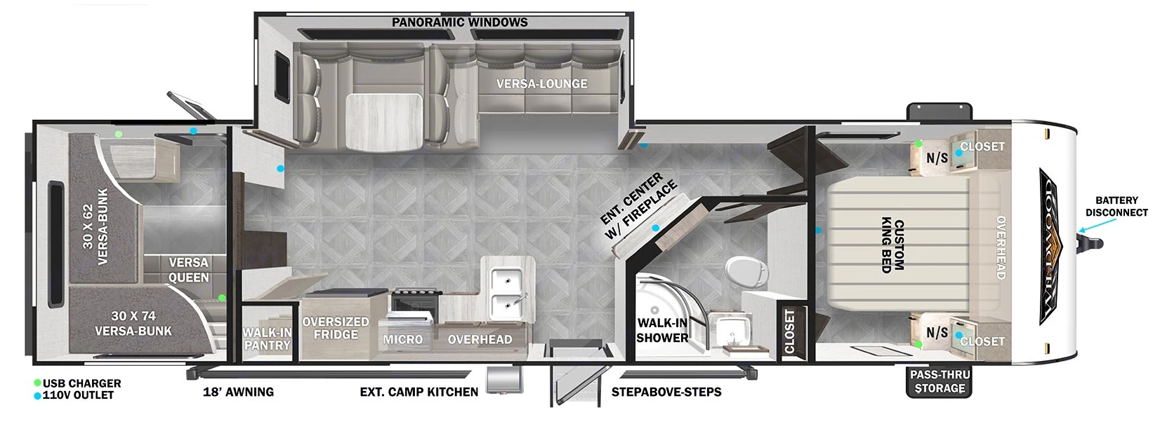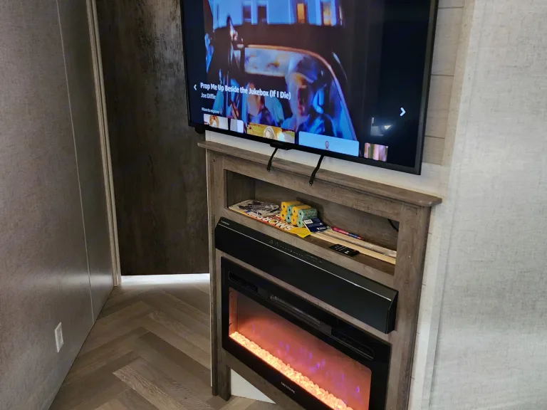 The stereo has FM/AM Radio, Bluetooth, and USB connections, and you can play your music both in and outside.Lounge out under the huge lighted awning and listen to the radio or your Bluetooth music on the outdoor speakers. Or enjoy the interior sound system in front of the panoramic windows and the electric fireplace!The rear cargo doors make for quick access for coolers, bikes or grills.