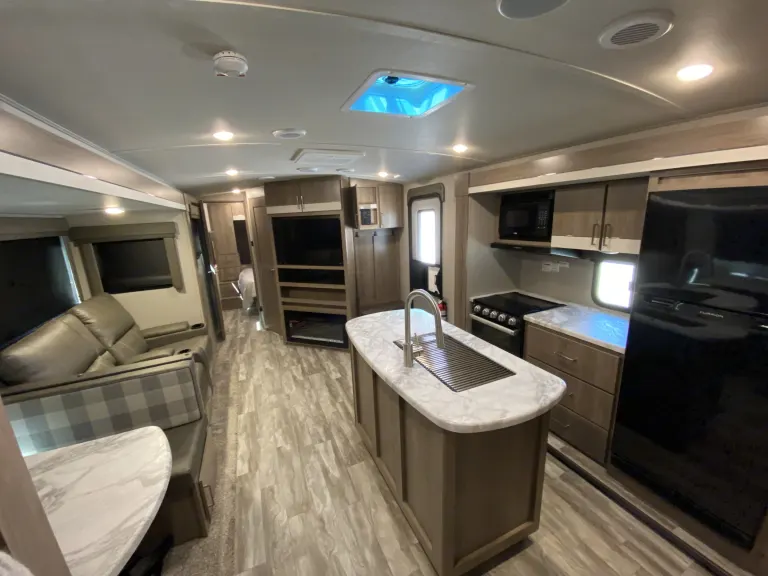 Invite the cousins to join you on your next camping trip in this spacious travel trailer that offers a bunkhouse with four bunk beds, three slideouts, plenty of storage and a fireplace. There are drawers as well for everyone's belongings. You can also offer sleeping space on the booth dinette. Theatre seating in the main living area, and the kitchen appliances including the island are on the opposite side. The cook will love the access to the outdoor kitchen and the 21' power adjustable awning. And the exterior pass through storage allows you to bring along the fishing poles, firewood, and larger camping gear.