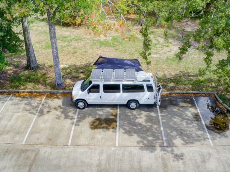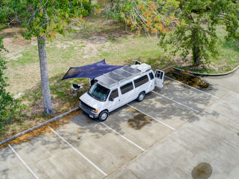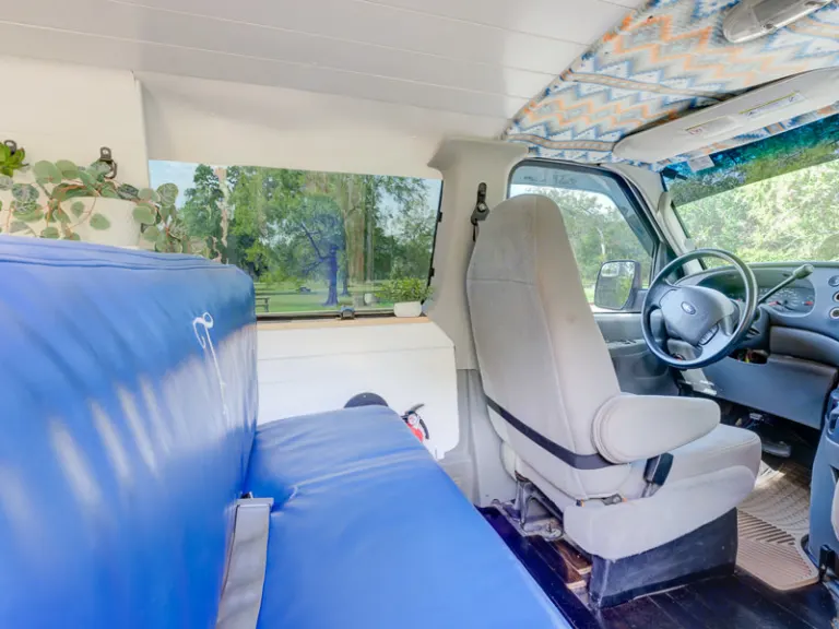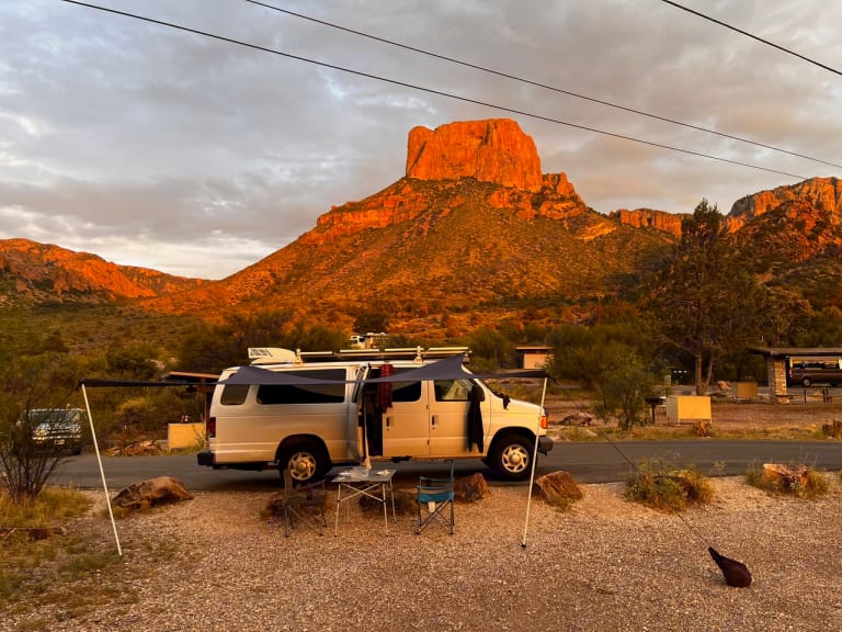 This is our home away from home. The E-350 Econoline van is a custom conversion with all the features needed for a great outdoor experience of a lifetime. This rig was built with real shiplap, real oak hardwood floors and built with high end components. There is great storage space under the bed for your adventure gear and comes with an optional rack for kayaks or hitch for extra storage if needed. The campervan comes with solar panels to power the refrigerator/freezer combo, 3x fans, Maxxair fan for cool nights, heater and heating blanket for freezing nights, sink, built in porta potty and tuck away cabinet, and many auxiliary accessories. The campervan is fully equipment with a queen-size bed and can comfortably sleep 2 adults and 2 children or 3 adults if you are okay with cuddling up. We have slept more in the van, but the 2nd row bench seat does have to be removed after you get to your final location to provide more floor space for sleeping.This setup has light dimmers for relaxing/seeing at night, but not spotlighting yourself. For hot nights, there is a rooftop air conditioner that requires shore power. However, if you need power in a remote location there is also a generator that can power the air conditioner as well. The rig also comes with an outdoor stove cooktop, oven/grill and shower. You can either shower with the water from the sink, or if you need hotter water it also has a propane water heater and shower pump. Need some coverage, it also comes with a canopy that can be set up as a standalone or tied in the the van itself to provide an awning feel. There is a small table for your outdoor needs and pair this with the 2nd row bench outside of the van and you have a nice living space to sit back and enjoy the great outdoors.This is a regular unleaded gas van and drives like any car you can drive. So don't be intimidated, this van is ready to go and just waiting for your next ultimate road trip.A few last things to note: the windows are very dark in tint which provide privacy and darkness for sleeping. However, we also include window shades to block out light 100% and provide full privacy if needed. The van also has a DVD Car Deck that allows you to play DVDs and and listen to music from your device by connecting via, Bluetooth, USB or audio jack. It also is powered by the solar power system and can be turn-on independent of the camper van engine being on.The interior of the van is 49" tall and the height of the van is 8ft at the tallest point which is the AC system connected to the roof of the van. The total length of the campervan is approximately 19ft and width is 6.5ft, and it does drive like a truck.Lastly, we do offer a 10% discount for repeat renters. Please reach out to us ahead of time before you book if you have booked with us in the past and we will submit an updated quote for rental.What's includedPillows