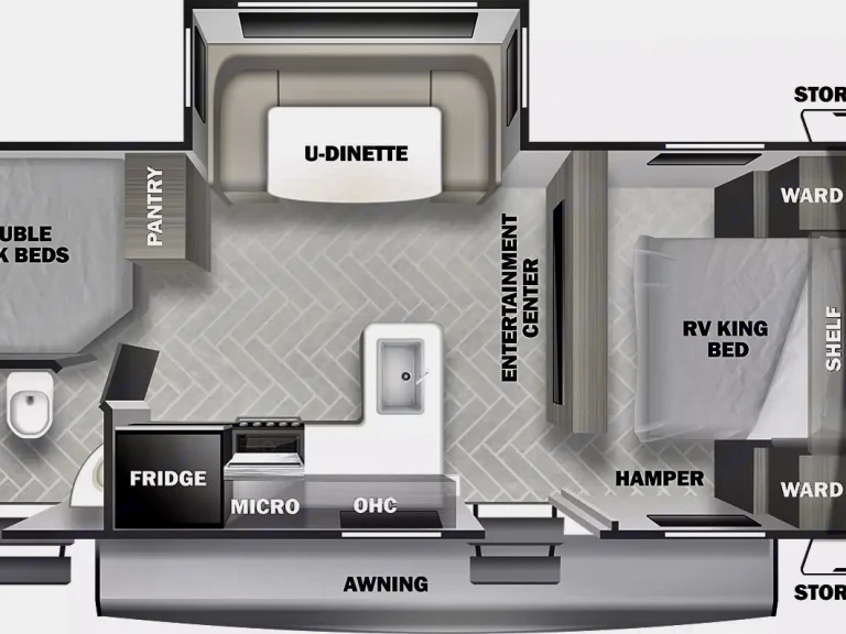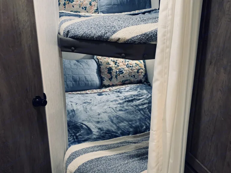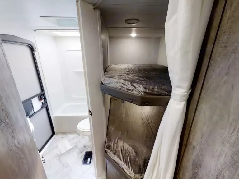 This is a trailer your whole group will love thanks to the double-size bunks, dual entry doors, and private bedroom with RV King bed. The fully-equipped kitchen is complete with a three burner range, a 17" oven, plus a microwave oven and an 8 cu. ft refrigerator and freezer. Everyone can enjoy meals around the U-shaped dinette, or outdoors under the 16' power awning.What’s Included?