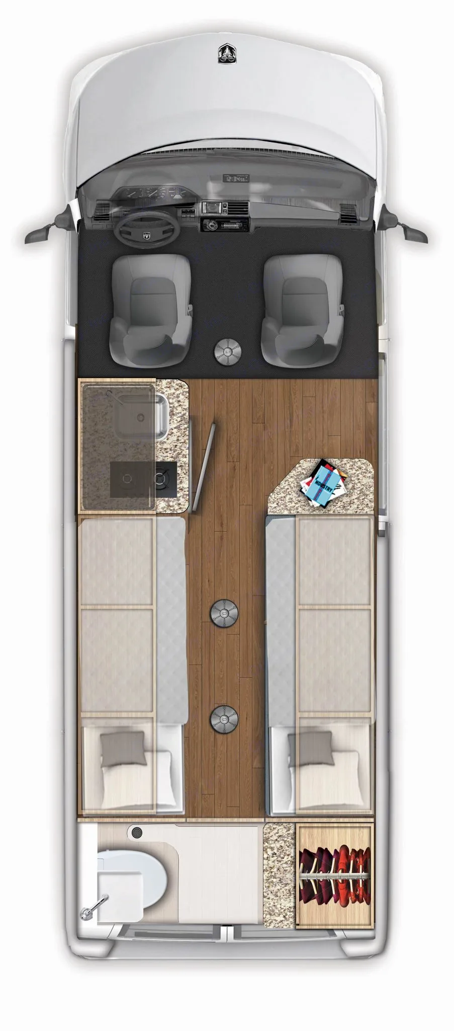 RV rental interior features a modular bed with light cushions, flanked by windows & controls, ready for your travels.. Carado Carado Class B 2018