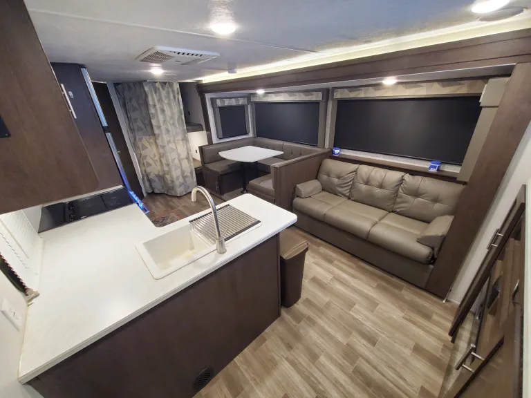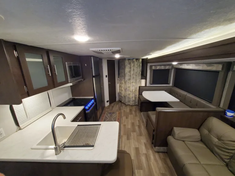 Our boho chic RV is perfect for couples and family travels. The rear features two oversized bunk beds with plenty of space to stretch out and relax. In the front we have our master bedroom, which comes with a full size queen bed, hanging closets on each side, and plenty of extra storage under the bed. Our living area includes panoramic tinted windows, electric fireplace, table, smart tv, and lounge area. The living area is also super spacious, you can transform the couch and the table into extra beds. What's includedAs part of your stay we are happy to provide you with: