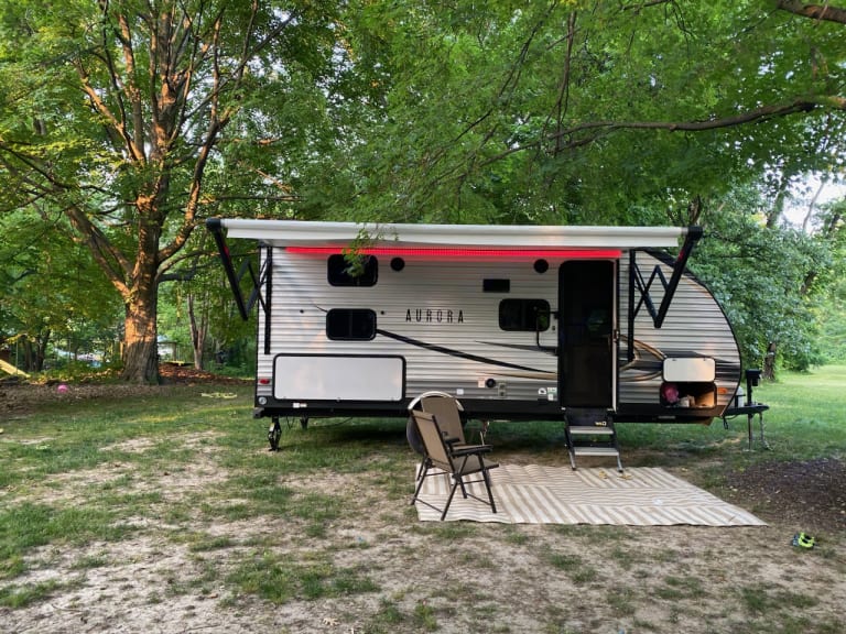 Welcome to Camp Aurora!She is a 2022 Forest River Aurora 18BHS.This is a rig we bought to camp as a family that I want to share with fellow outdoors lovers. There is plenty of space for your friends and family around the U-shaped dinette or sit outside under the large awning and enjoy the sounds of nature. What's includedIncluded with Camp Aurora:Additional Stabilizing Jacks