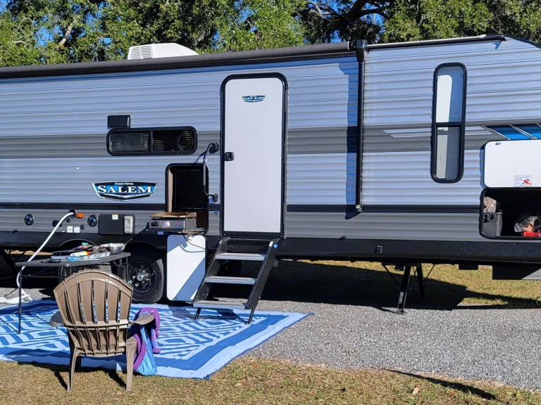 Hokule'a - Hawaiian for Star of Gladness, the star Native Hawaiian's used to guide all their travels - is a brand new 2022 Forest River Salem 26 Dbud travel trailer. She's got the most amazing "Versa Lounge." The 26Dbud is the perfect family travel trailer, with double bunks at one end and a queen bedroom at the other. The dinette converts to a bed. The jack-knife couch also converts to a bed. You also get a fireplace (electric heater), full kitchen with glass-fronted cabinetry and large pantry, a large U-dinette, and the customizable Versa-Lounge with Stow N Go Storage. One super slide makes the living area massive. Outdoor gas griddle and fridge. The power awning adds more than enough shade on a sunny day. There is a separate door to the bathroom for easy access. What's includedAn inflatable Stand-Up-Paddle Board, beach umbrella, fresh linens, pillows, throw blankets, beach towels, shower towels, camping chairs, kitchen supplies - Keurig, French Press, electric kettle, pots, pans, cooking tools, plates, cups, utensils, common spices. If you need something not listed, we probably have it and can provide it. Just bring your clothing and food. RecommendationsWe are close to Orlando, Tampa, Ocala, Gainesville, and the entire Nature Coast. We have really loved camping on the Space Coast and Flagler Beach, Manatee Springs, Weeki Wachee, Ichetucknee, and many other places. Other things to noteDelivery only