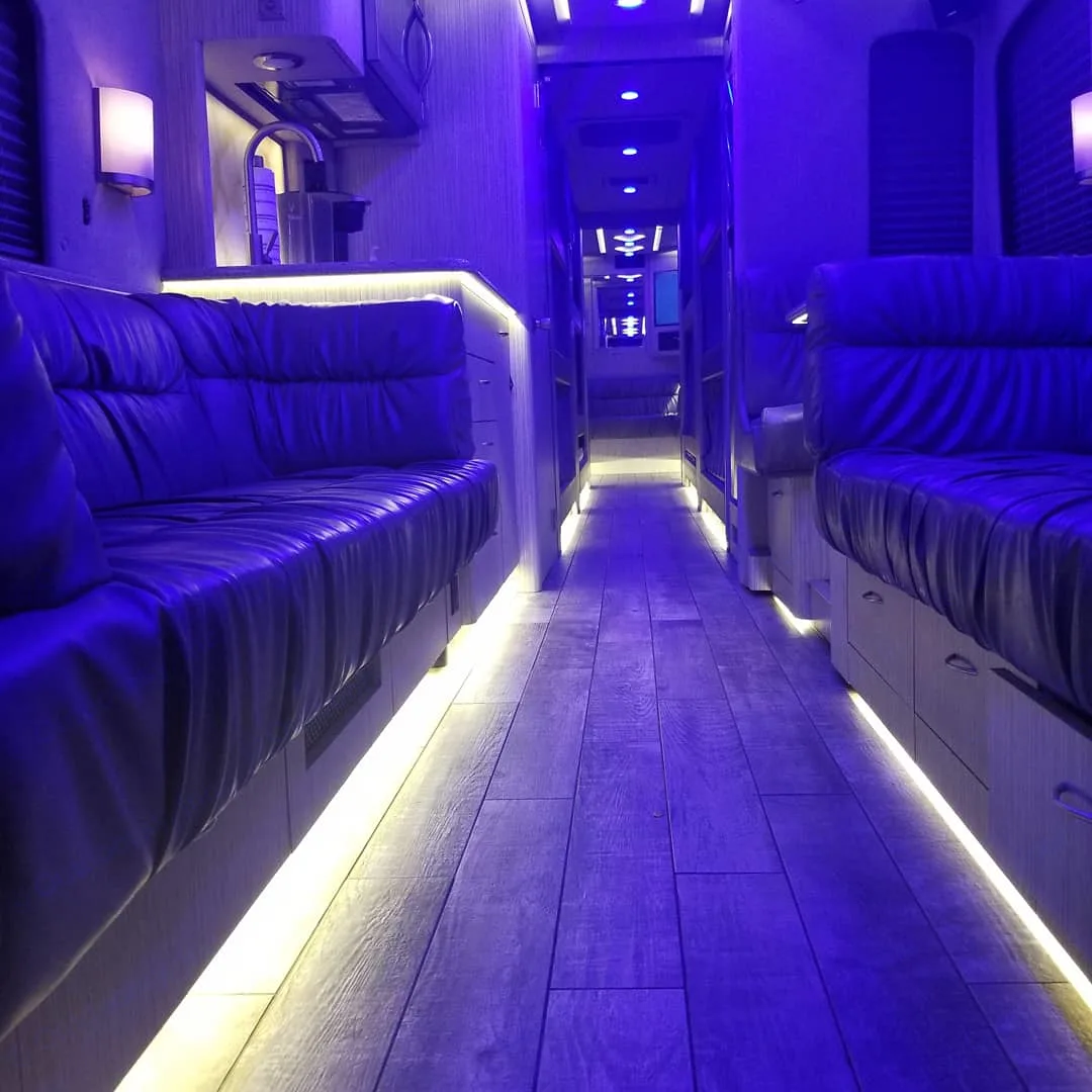 Hardwoods, gray interior, with front slide living room, 2 televisions, play station, galley kitchen, bathroom with standup shower, 12 bunks, and state room in the rear. Working travel satellite.