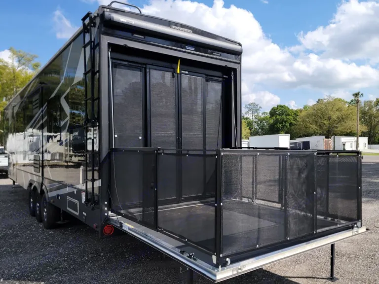This unit requires a minimum of 50 amp service. No generator usage and NO Boondocking.If you are looking for luxury toy hauler, this one is for you.
