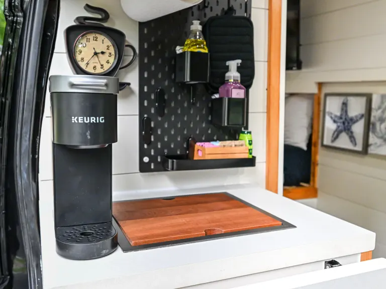 This 2-person camper van features a full-size bed and comfortably sleeps 2 adults. It can also accommodate 2 kids, making it perfect for small families.
