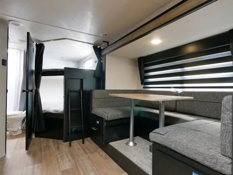Very popular floor plan laid out with slide out for great interior space. It has a private master room with queen size bed, two bunk full size beds. Dinning can become a bed and one adult can sleep on comfortably. Sofa (jack knife style) also can become a bed, although it better suited for children.