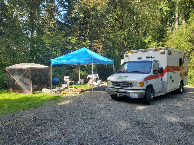 Have you ever watched an ambulance scream past you and wondered what it feels like to drive one of those beauties? Here’s your chance! Explore the splendour of the Pacific Northwest from the comfort and safety of this show-stopper retired ambulance. The powerful turbodiesel van comes with everything 2 people and pets would need for a memorable road trip in most weather conditions. Plenty of power from the V8 gets you into and keeps up with highway traffic with ease, while the low-down diesel torque will climb almost any hill or mountain road effortlessly. And it sounds like a semi!! You gotta love the diesel “dock-dock-dock” sound :). Maybe I should have named it “Dock-Dock”…but I digress