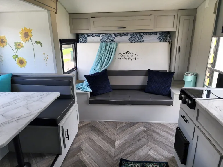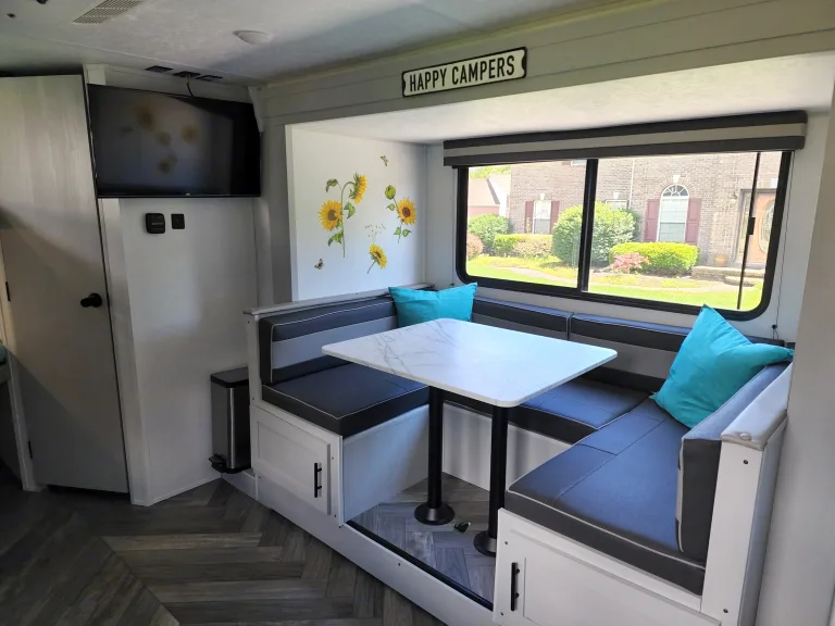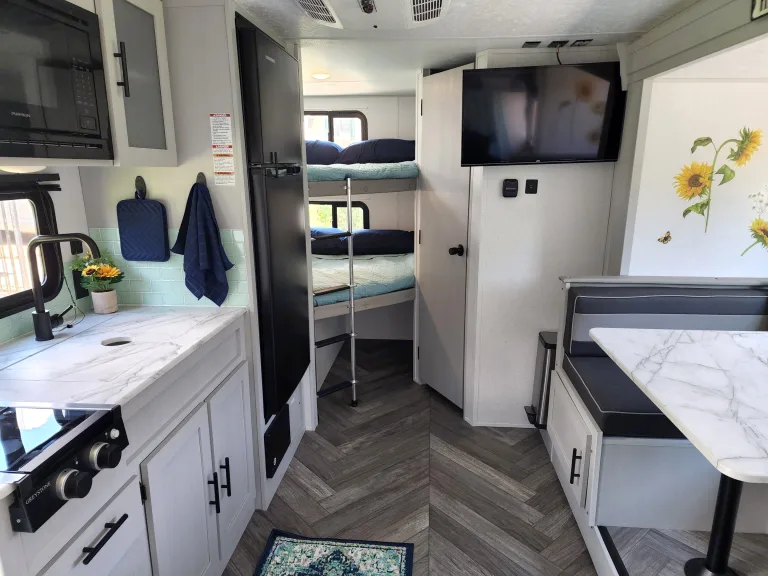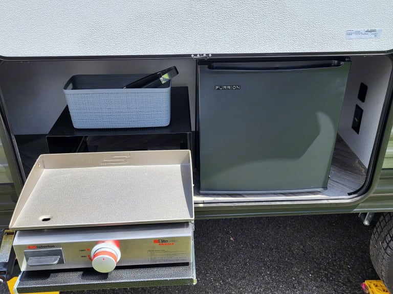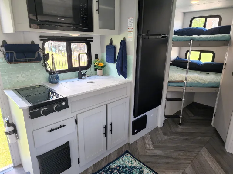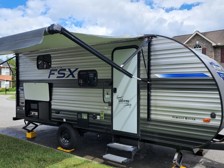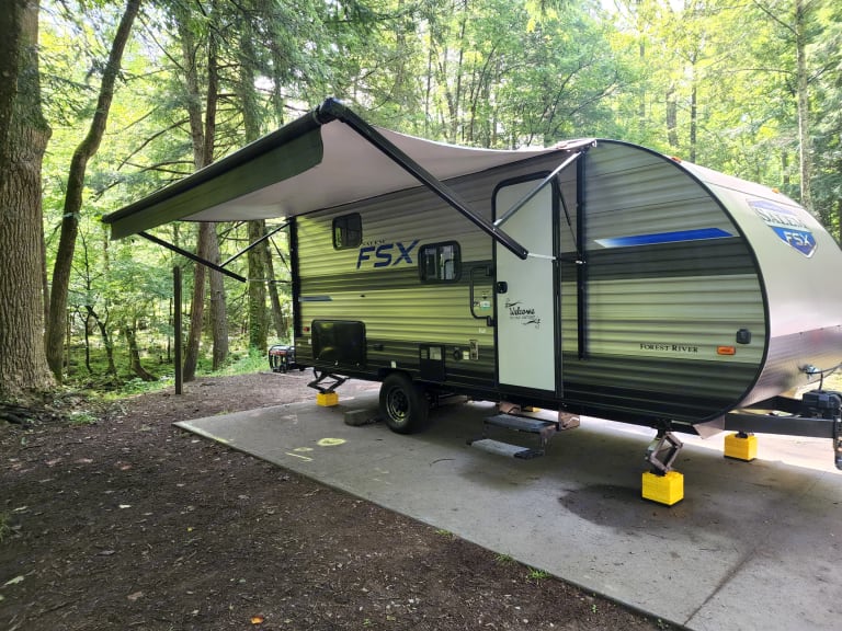 Use our 2021 Forest River Salem 178bhsk for all your fun in the Great Smoky Mountains. Hose off after your explorations using the outdoor shower (with both hot & cold water taps) before relaxing under the 14ft canopy with LED lights. Cook dinner in the griddle in the outdoor kitchen or grab a cold drink from the outdoor fridge. If the weather isn’t that great, then you still have all you need to be fully functional inside. The indoor kitchen is equipped with a 2-burner stove, a farmhouse sink, a keurig, a microwave and a large capacity 11cu ft fridge/freezer combo. Enjoy a delicious breakfast in the comfy wrap-around dinette while you plan your day’s adventures. Stream a movie to the 32” TV using Starlink satellite internet while getting ready for bed. Easily sleep 6-8 in AC/heated comfort between the queen-size Murphy bed, the full-size double bunks or the collapsible dinette that turns into another full-size bed. There is also a full bathroom with shower, vanity and toilet making your life easier and helps to eliminate those midnight trips to the bathhouse with little ones. No matter the season or the adventure, this camper can be your haven of rest and relaxation so you can get back out there and make more memories. For a full list of the basics that is stocked in the camper, please feel free to message!Other things to noteCampsite Requirements: