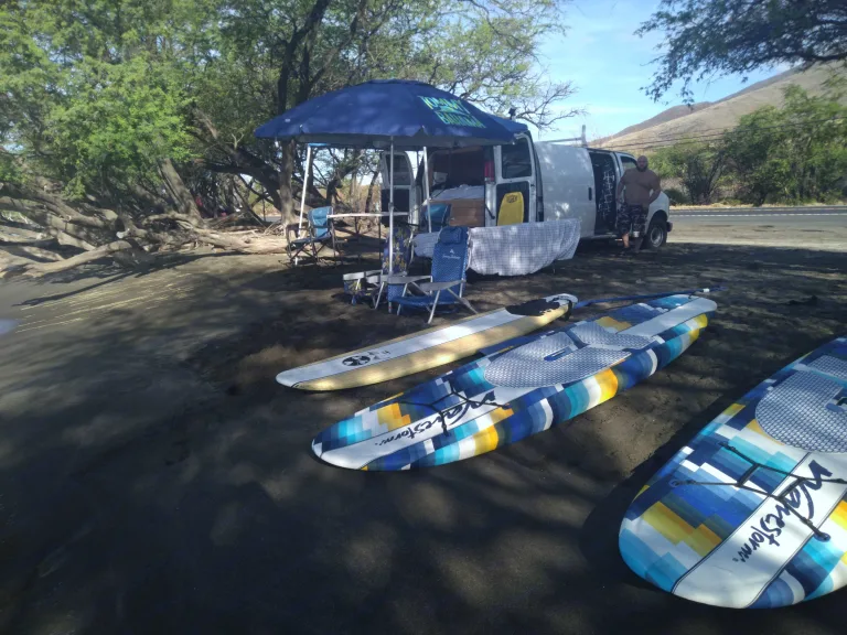 Aloha, this van has been tricked out and comes w on-demand hot showers, 2 surfboards, 2 paddleboards, snorkel gear, fishing poles, tackle, generator, toilet, queen bed, beach chairs, umbrellas, cooking utensils, 2 burner stove, towels, bedding, coolers, lighting, table and chairs, and a pop-up tent for additional shadeWhat's includedVan comes with fresh linens, 2 pillows, 2 towels, 2 surfboards, 2 paddleboards, 2 Beach chairs 2 umbrellas, 2 snorkel sets w fins, BBQ, 53 gallons freshwater, on-demand hot shower, toilet, generator, table for eating, cooking utensils and plates, tp, lighting, cot, 2 fishing poles w/ tackle, Coconuts upon request, coconut opener, power station jump starterRecommendationsVan has gone everywhere on the island Hana, Haleakala Nation Park and Observatory, seven pools, black sand beach, red sand beach, Wainapanapa Caves, Iao valley, jaws, Hookipa, mama's fish house, Hookipa beach, Lahaina, Kihei, Wailea,Other things to notePlease clean up after yourselves and help keep Hawaii looking beautiful, please respect locals and pull over for fast driving locals on Hana hwy, please no blocking roads in case of emergencies, aloha