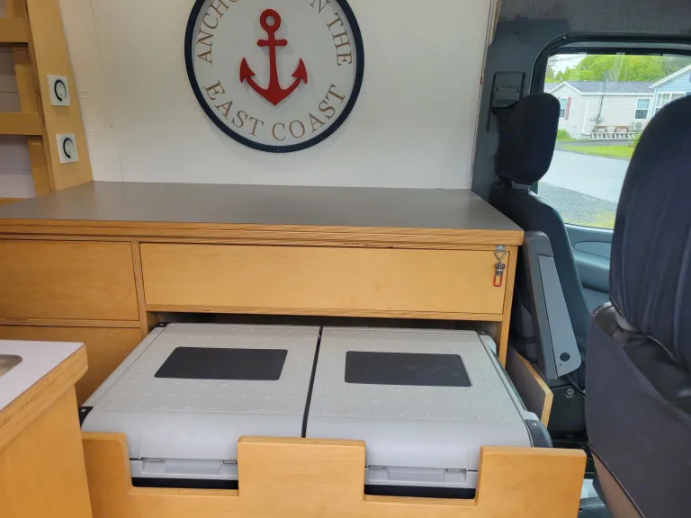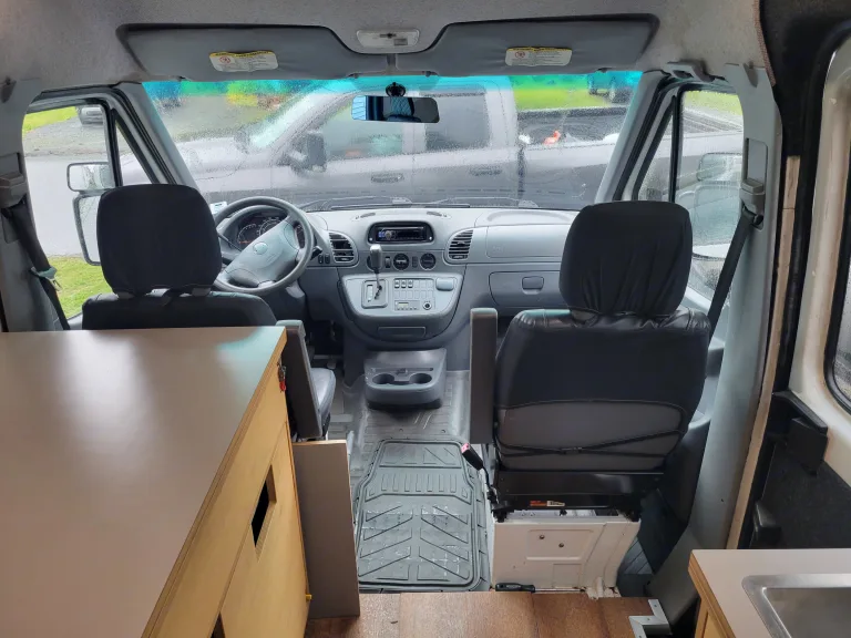 Fun little van conversion for your getaway. Comfortable bed, with a fridge/freezer combo. The diesel engine is excellent on fuel. With solar and batteries any destination is possible.