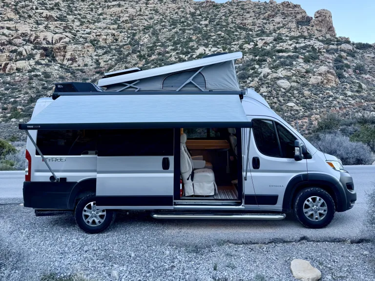 This 2024 camper van offers seamless power and extra space with its pop-top roof.
