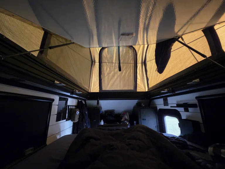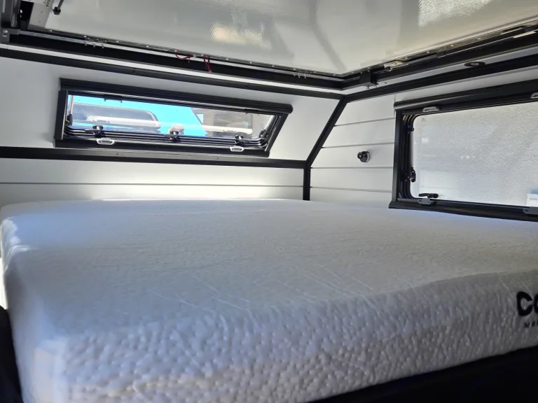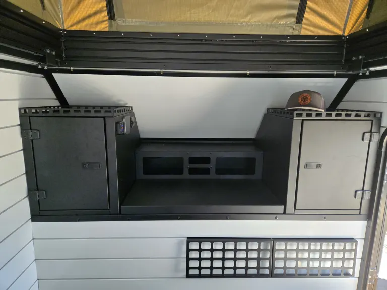 Inside the trailer are two full size queen beds, one below and one in the poptop area. There is also numerous charging ports, more 110v outlets, and a monitoring system to keep an eye on the available battery. Interior cabinets offer storage for your clothing or extra bedding, and a small desk with cubbies lets you use and store a laptop or other items.What's included• Optional space heater