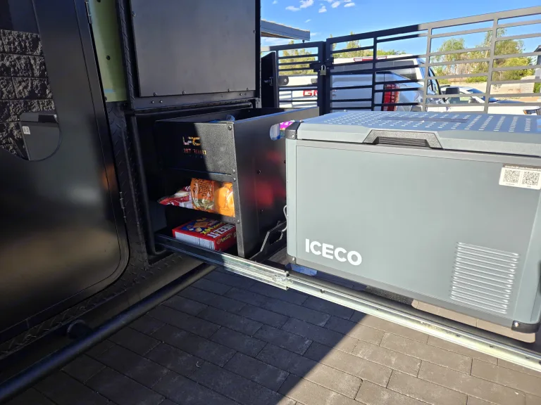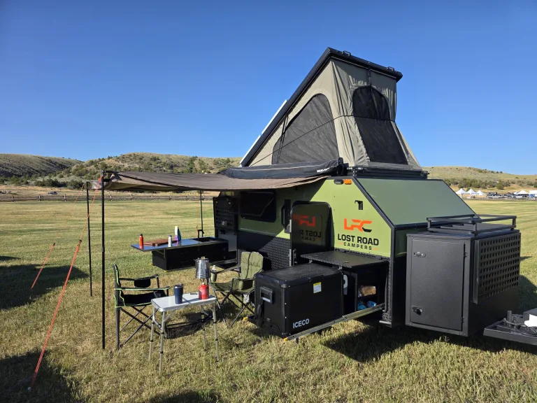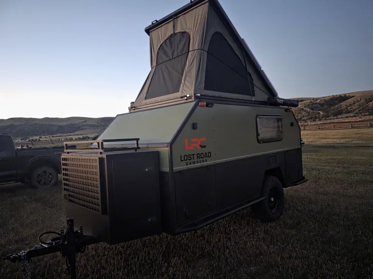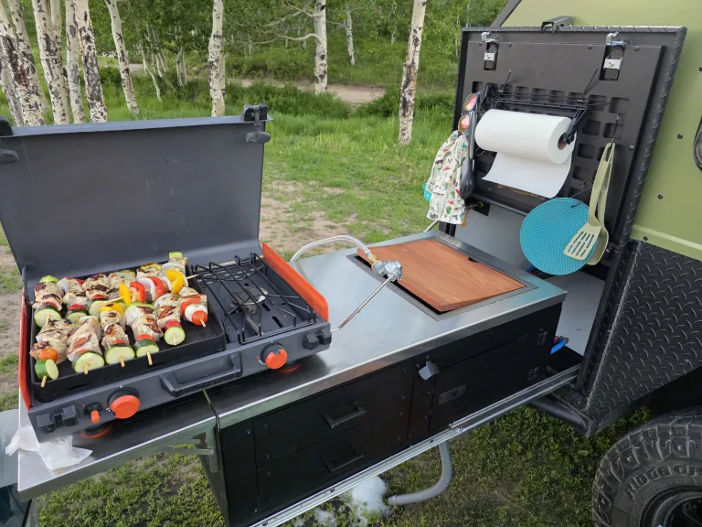 This lightweight trailer is ready to go with you on your next expedition! Weighing 2600lbs dry, this trailer is very easy to tow with most midsized SUVs or Trucks. It's made to withstand the rigors of offroading, with oversized all terrain tires, great ground clearance, and an articulating hitch. The exterior features a pull out kitchen with storage and sink with hot and cold running water, a quick connect propane fitting to set up the stove, and 110v outlets to power your favorite cooking appliances and coffee maker. There is a pull out refrigerator and pantry on the same side of the trailer, with ample storage for your food and drinks. All these amenities sit below the 270 degree bat-wing awning. The driver side houses the outdoor shower tent and nozzle. Just open and unfold the tent and enjoy the instant hot water. The front storage box gives you plenty of space to bring any necessities, and the rear trailer hitch is compatible with any standard mounting bike/kayak rack.