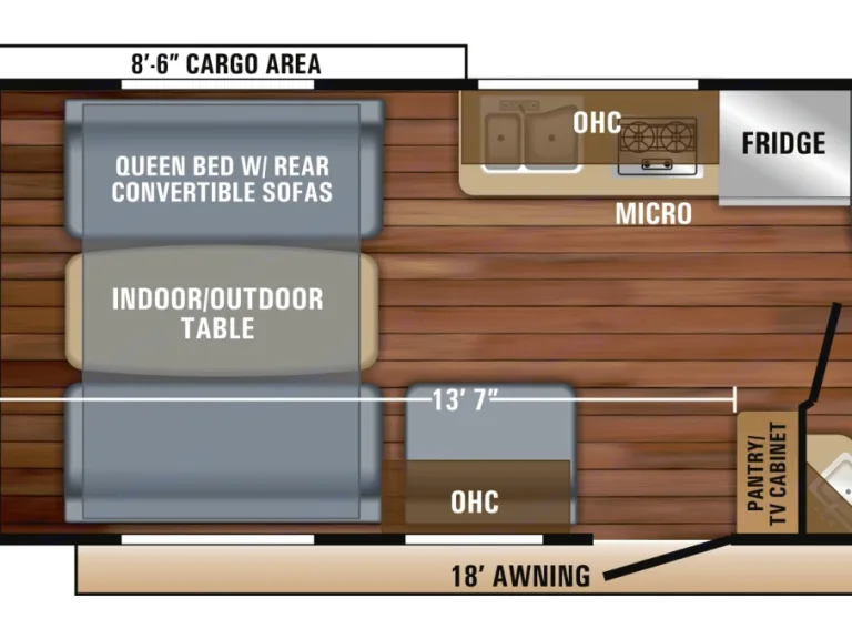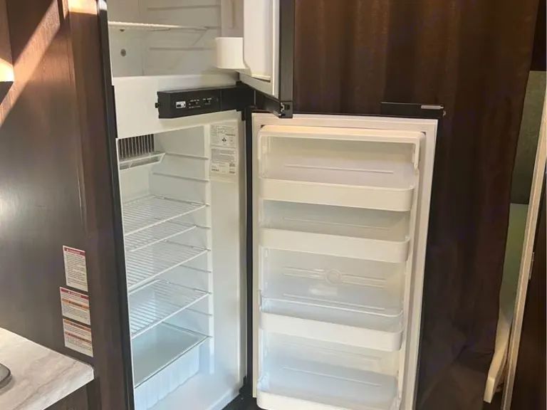 This is a great little toy hauler that is big enough to fit in a quad or side by side and yet still be light enough to tow with a 1/2 ton truck. It's perfect for a family get away even if you don't have toys to haul as the back ramp door turns into a porch with screen making the 26 feet long trailer feel even more roomy. There's a queen bed for mom and dad and then one queen size bunk and one queen size dinette conversion for up to 4 kids or 2 more adults. Gvwr 8000 lbs.Electric awning, onboard fueling station, outdoor shower and bluetooth speaker system are some of the extras you'll get to enjoy. The fridge and freezer is extra large for all of your drinks and yummy's. In the toy hauler area you can put in all of your toys, bikes and extras and even take along your BBQ grill!