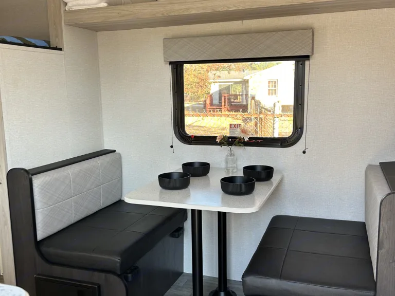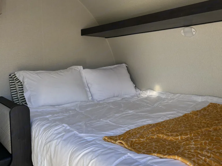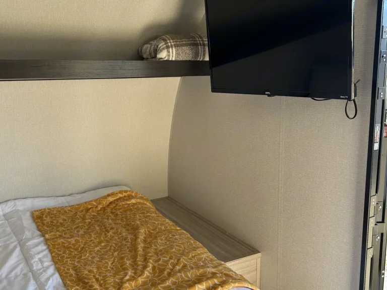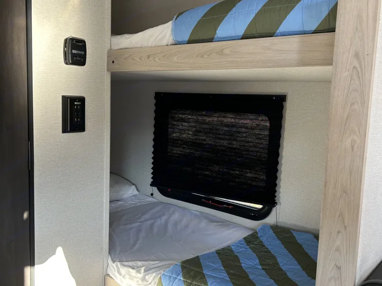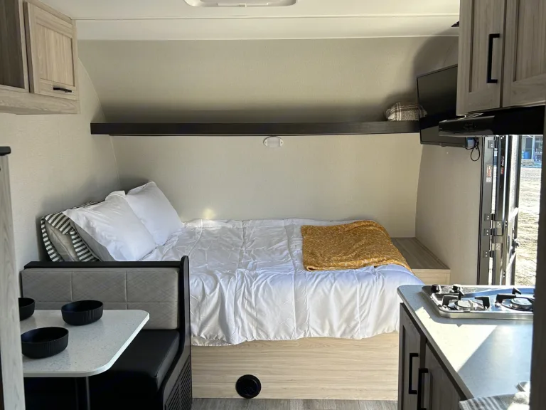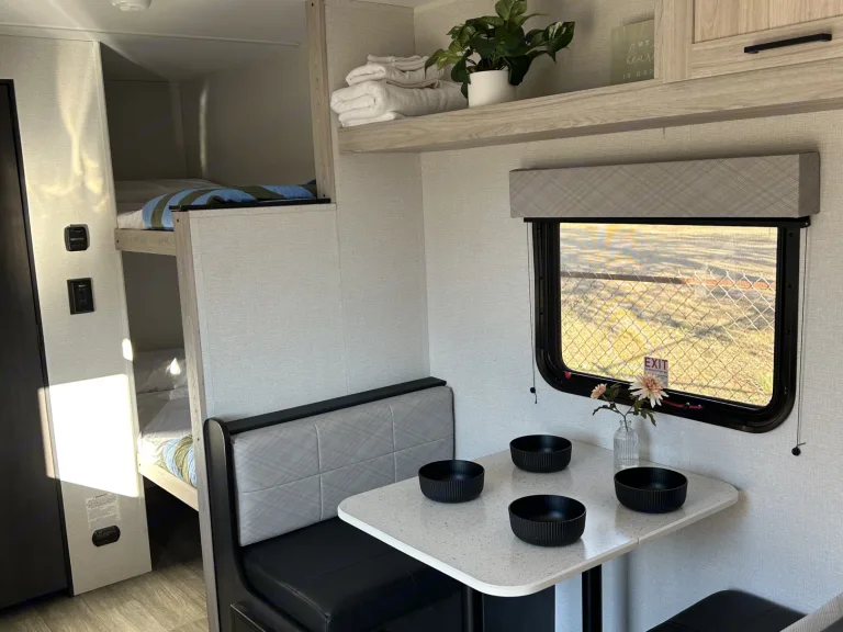 Sleeps up to 5–6 (Queen bed + convertible dinette + bunks)