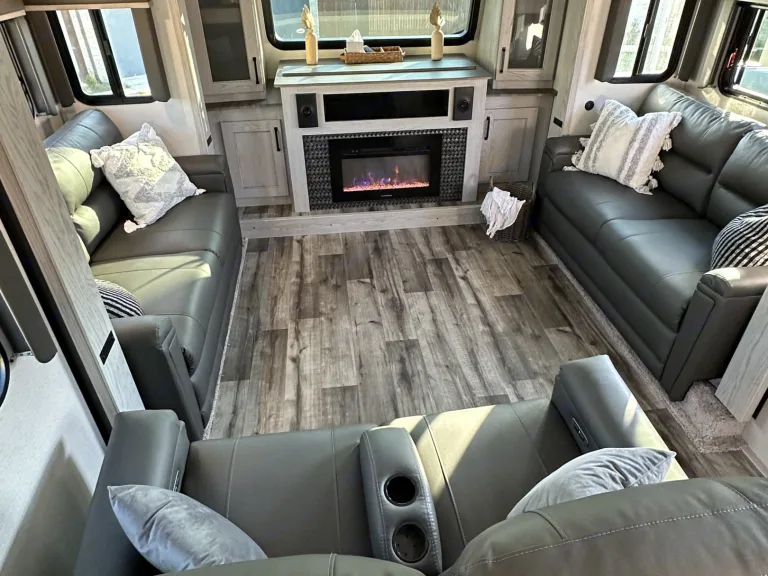 Come relax in nature with this ultimate glamping camper! Whether you want a stay-cation, girls weekend, family trip, lodging for a visiting relative, any and all of it it! Even for those who don’t love camping - the Lazing Laurel is the rig for you. Think luxury Airbnb meets nature with this fully stocked, delivered and set up trailer. You just bring food, clothes and yourself - we got the rest covered! We deliver the trailer to your campsite or property, hook it all up and will walk you through what you need to know (which isn’t much since we do the setup). You get to kick your feet up and enjoy the stay!The Lazing Laurel is a brand new 2023, amenity filled 42 foot fifth wheel. With seven sleeping spots (or more with kids), two ACs, full hookups, a combo washer/dryer, solar, stainless steel stove/oven/microwave, electric fireplace, and even a full residential fridge. We’ve filled it with all the supplies you could want out of a vacation rental. Coffee pod machine? Yep! Blender for margaritas or smoothies? Sure do. Washer/dryer for dirty clothes? Of course! Toiletries in the bathroom like a luxury hotel? You bet! Plain undecorated insides? Absolutely not! Laurel’s got some personality with a blend of modern farmhouse and bobo style.The Lazing Laurel feels like a true home on wheels with separated living areas. The front living room features two couches and two recliners that face a flatscreen, which is fully retractable so you can tuck it away and enjoy the 180 degree views. She also has bluetooth speakers to have a party both inside and outside, while you sit under the retractable awning.Planning a trip with kids? Our rig features a loft set up for three kids with a wall to wall bed. Real stairs (not the common ladder) making it safe for the littlest of kids. We’ve also included a bunch of Family friendly games!Camping with friends? A curtain can be drawn to give privacy to the living room, which features two pull out sofas (to make two full’s). What's includedSleeping arrangements -