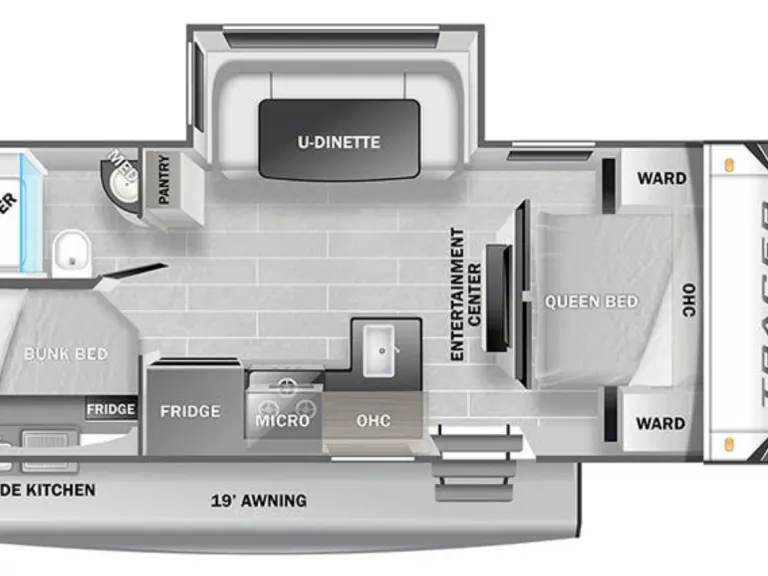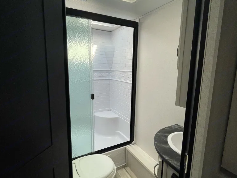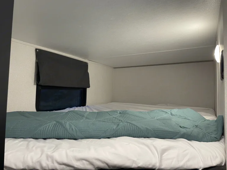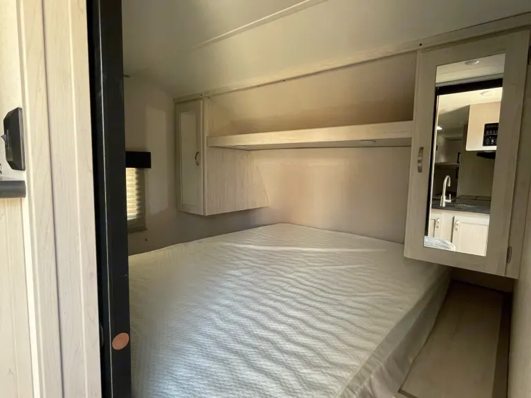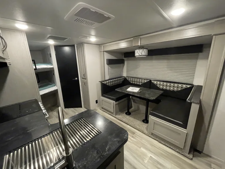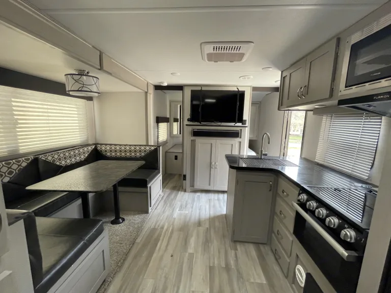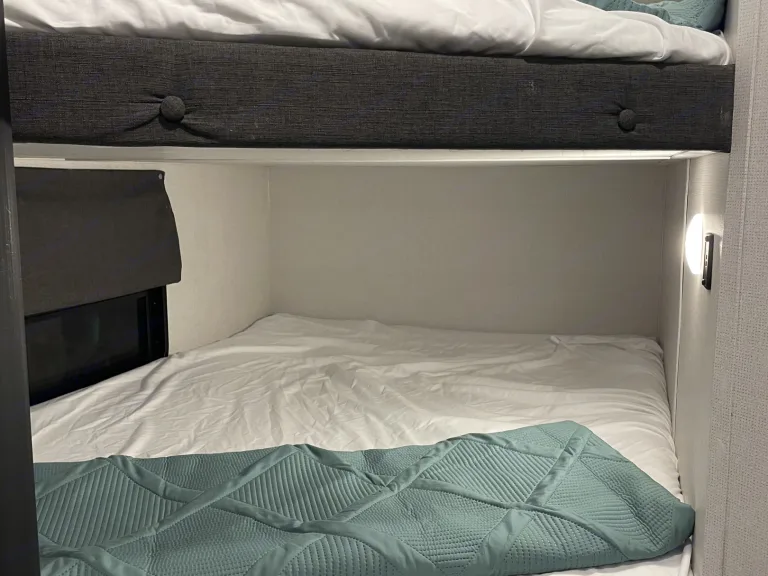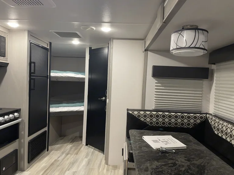 Need space, this travel trailer has it. This camper has everything you require for a great weekend away or a few weeks traveling the country. Need privacy, slip into one of the full-size bunk bed nooks, or close the doors to the queen-size master bed.The camper is equipped with newer finishes and includes a sink, refrigerator, oven, stovetop, and U-shaped dinette to seat 5 comfortably. Want to cook outside instead, this camper is equipt with an easy access outdoor kitchen.Enjoy an indoor shower or if you find yourself covered in mud, rinse off on the backside of the trailer using the outdoor shower hose. Perfect for getting messy and cleaning up before heading inside.What's includedWhen renting with us, our travel trailer comes with fresh linens on the full-size bunk beds and queen-size master bed. With exception of pillows, they are not included.The lavatory includes three rolls of toilet paper, liquid hand soap, travel-size shampoo, conditioner, and one can of spray sunscreen.Trailer Rental Includes: