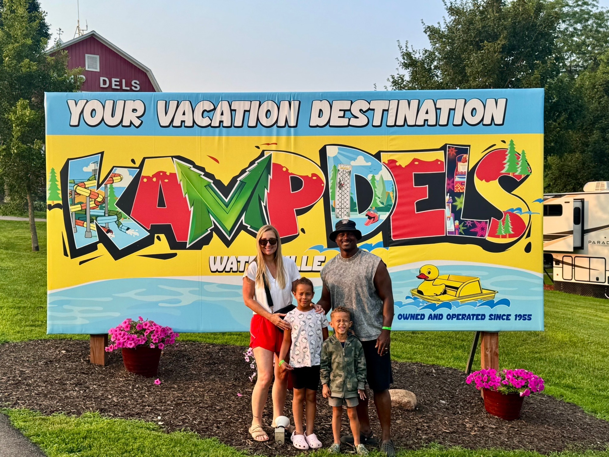 The Jr. Suite/Theatre Room featuring three bunk beds, and a pullout full bed futon with a door to block sound if other guests are still awake in the living room. There is also a 55” TV lots of storage for clothes, and an attached 2nd bathroom. The bathroom is extremely convenient as well with its own entrance/exit to the exterior. Very handy for not having to walk through the entire camper to use the restroom. You can simply walk right into the bathroom with the 2nd door.The exterior features a 20’ awning that lights up at night. An outdoor kitchen, (that also lights up at night) quick connect propane for the grill, two refrigerators (Perfect for kids and adults), with cupboards and shelving. There is a ton of storage that goes all the way through the camper. An outdoor shower with suction cup mount for hands free use and a high pressure quick connect hose.What's includedFresh Linens, Pillows, blankets, towels, etc. Cups, plates, silverware, knives, cutting boards, bowls, etc. Toilet paper, paper towels, sanitary supplies. Garbage cans (Inside and Out including bags) large camper rug for under awning. Other accommodations can be met upon request.RecommendationsCamp Dells, Camp Shamineau, Jellystone parks, Kieslers Campground.Other things to noteNo smoking inside rig