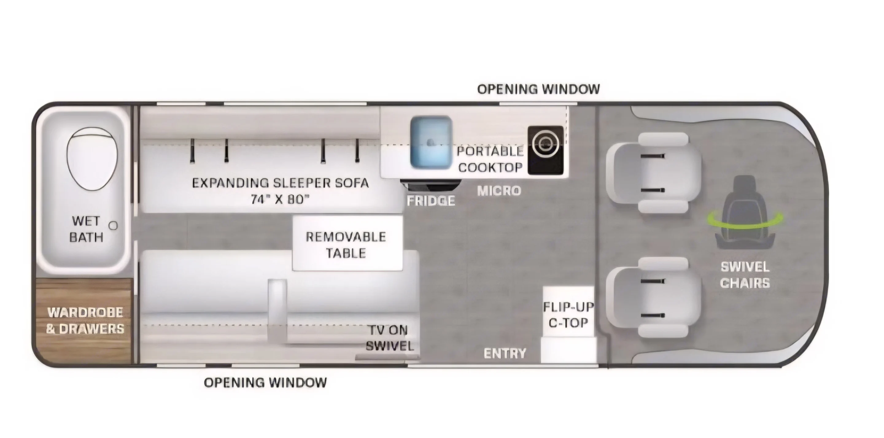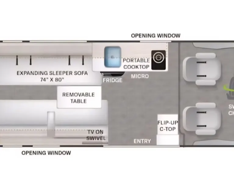 Sleeps 2–3 comfortably — Rear fold-out sleeping area King/ convertible dinette