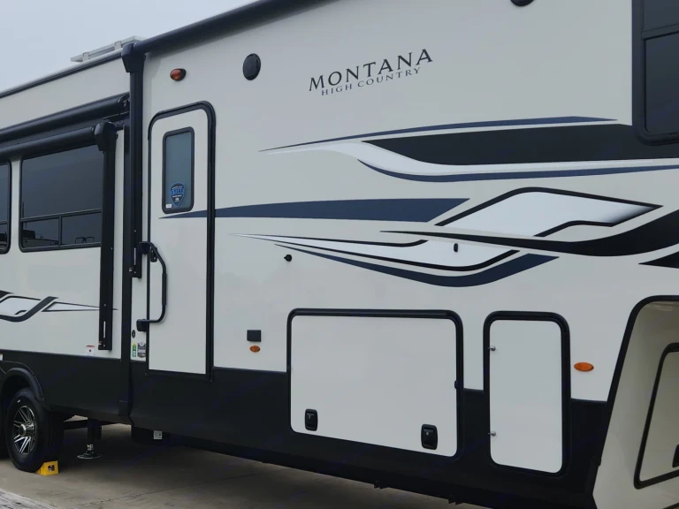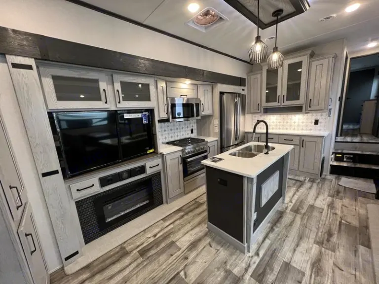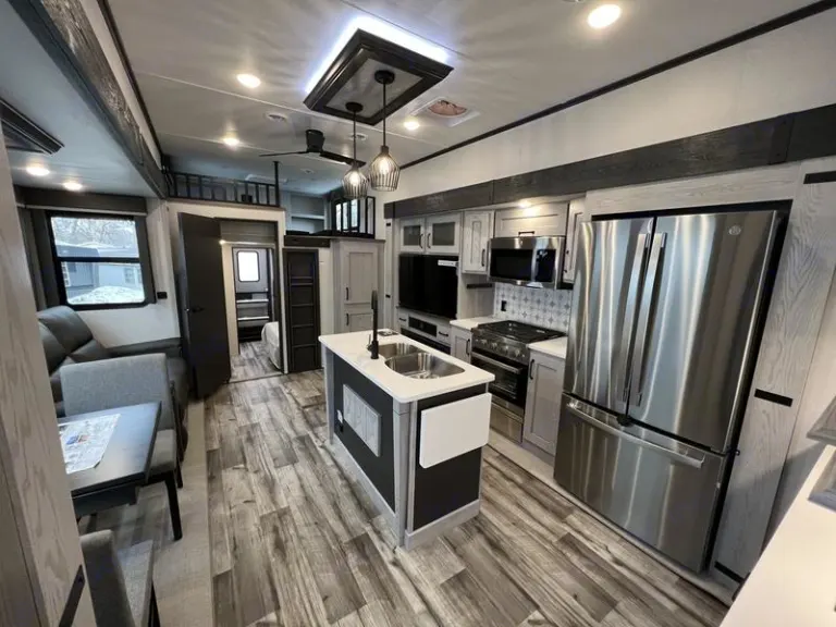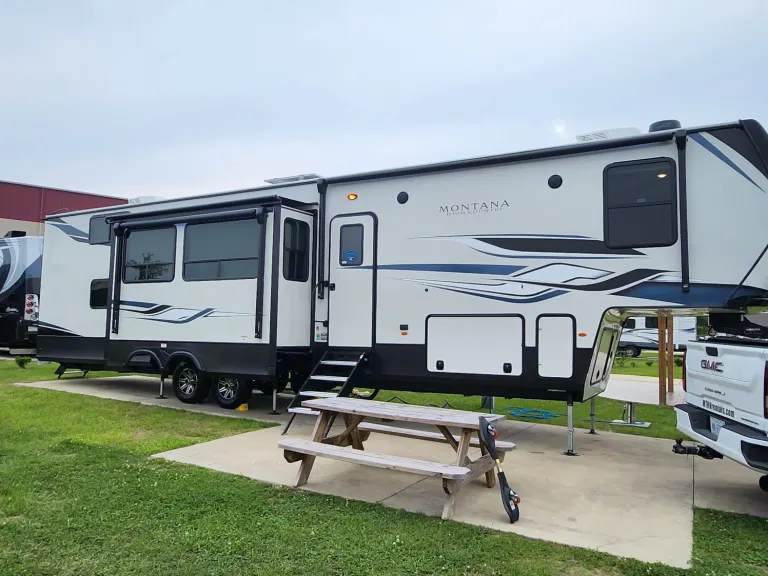 The 2023 Keystone Montana High Country 381TB is the ultimate luxury fifth wheel trailer available for rent from Mtrv Rentals. This spacious and well-appointed trailer boasts a length of 42.5 feet and sleeps up to six people comfortably. The unit features four slide-outs, providing plenty of room for everyone to stretch out and relax.As you step inside, you'll immediately notice the stunning interior design, featuring luxurious furniture and high-end finishes. The living area features two comfortable recliners and a large dinette with 4 chairs, perfect for kicking back after a long day of adventure. The entertainment center includes a large flat-screen TV and fireplace, perfect for cozy nights in.The kitchen is a chef's dream, featuring a large island with a double sink, high-end appliances, including a residential refrigerator with a built in ice maker and water dispenser. Plenty of storage space in the kitchen as well. You'll have everything you need to prepare delicious meals during your stay, including a three-burner stove, oven, and a refrigerator/freezer.The master bedroom is a peaceful oasis, complete with a comfortable king-size bed, plenty of wardrobe space, and a large flat-screen TV.