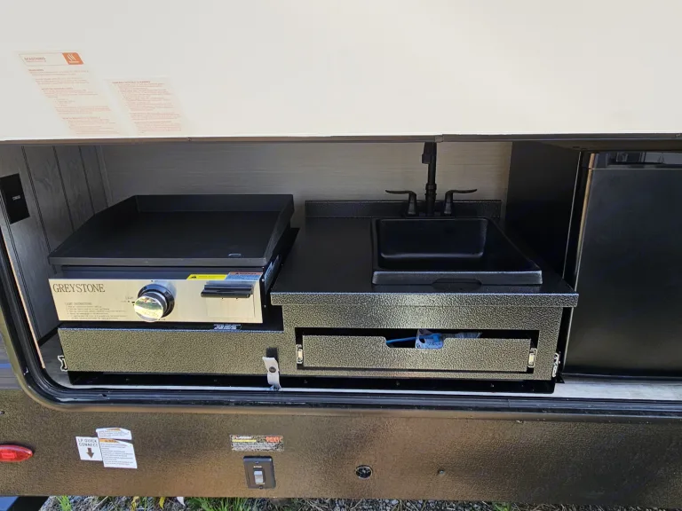 Power awning with LED lightingOutside kitchen with fridge, sink & griddleOutdoor speakers & TV mountDual entry doors (main + half-bath access)Towing & SetupWeight: 9,295 lbs (dry)Hitch Weight: 1,255 lbsDelivery & Setup Available! (Ask about rates)Why Rent This RV?