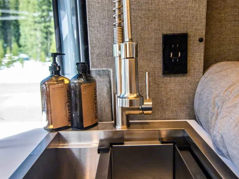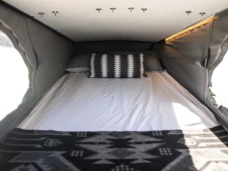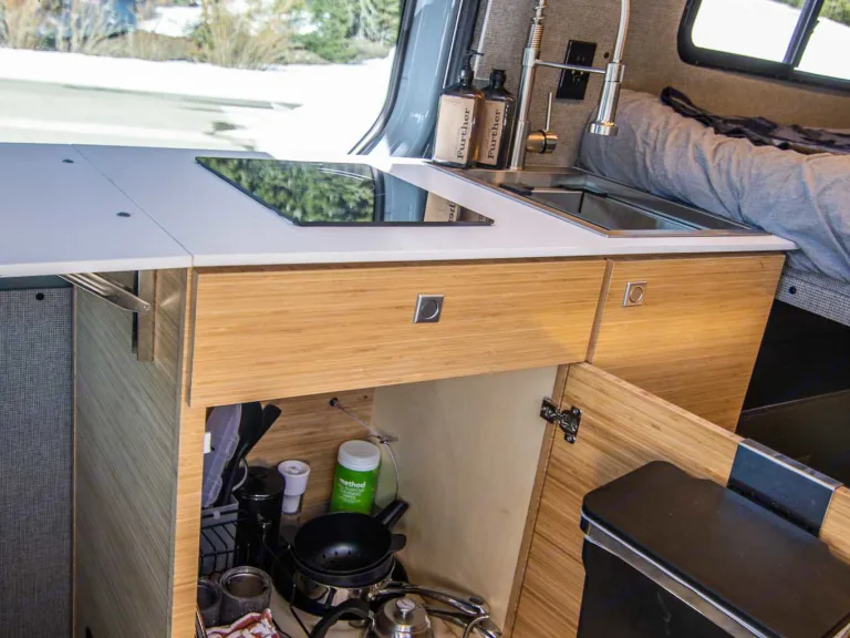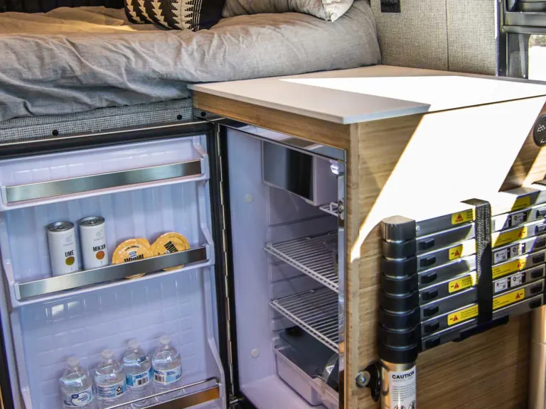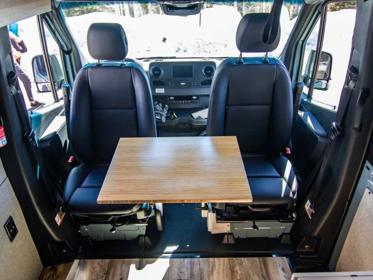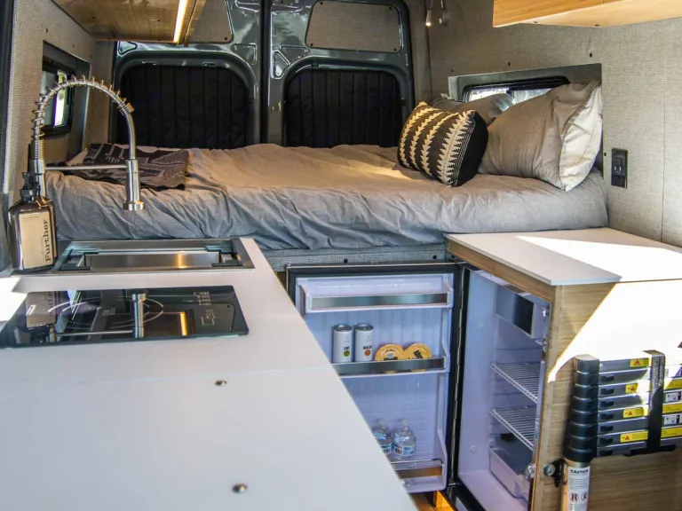 Our Modern 2.0 vans feature bamboo upper and lower cabinets, comfortable sleeping for four (second bed platform in awesome pop-top area!), and a large garage just waiting to be filled with gear for your next adventure. The rear bench seat in this rig does not have seatbelts and is not intended for passengers while the rig is in motion. To top it all off this van has a stainless steel refrigerator and freezer, induction burner stovetop, outdoor shower and a full dinette that’s sure to dial up your dinner under the stars.