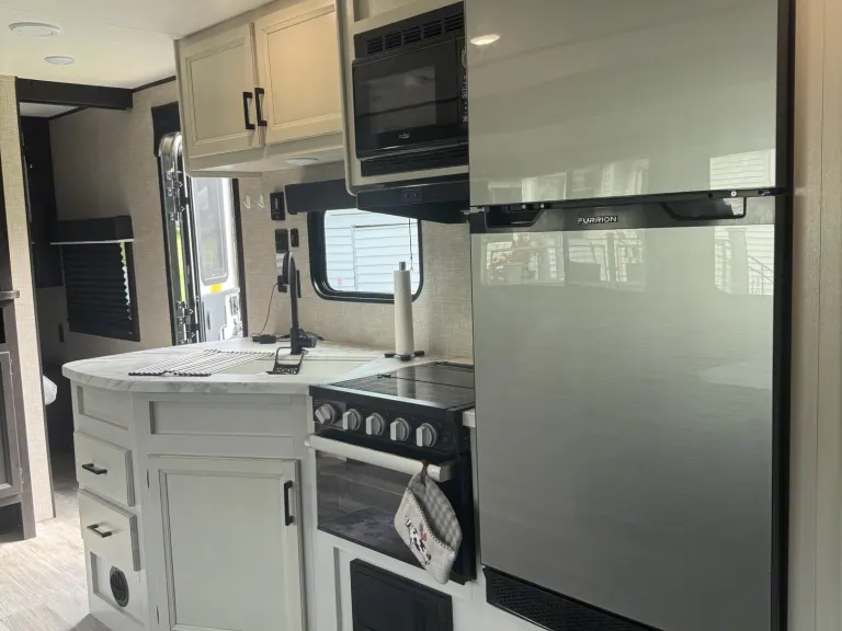 Adventure in style! Spacious, modern, and fully equipped with a kitchen, bathroom, and cozy sleeping areas for up to 8 people - Perfect for family trips or couple getaways. Just pack your bags and hit the road!This trailer sleeps 6 very comfortably and 8 comfortably and includes an outdoor kitchen, outdoor shower, retractable awning, smart TV, and so much more! It is available for self-towing by experienced and equipped individuals or for delivery within 30 miles of Mahopac, NY (please see details). Other awesome uses: need extra space for a family reunion, event, or wedding? Home renovations making it uncomfortable inside? We can park this in your driveway!Pre-Travel Shutdown Checklist- Do not travel with a full fresh water tank—dump it before departing.- All tanks (fresh, gray, black) must be emptied before travel. A dumping fee applies if gray or black tanks are returned full.- Check tank levels daily. If you're new to trailer camping, we’ll gladly demonstrate this at your walkthrough.- Secure all items, including appliances and dishes, as shown during the walkthrough.- Tightly close all doors, cabinets, and the refrigerator.- Store hoses, cords, and surge protectors in their designated bags to avoid damage or loss.- One set of keys is provided (door and hatch). A $30 fee applies for lost keys.- Outdoorsy insurance is required; we strongly advise against selecting the lowest coverage tier.What's included• Fresh linens, pillows & blankets