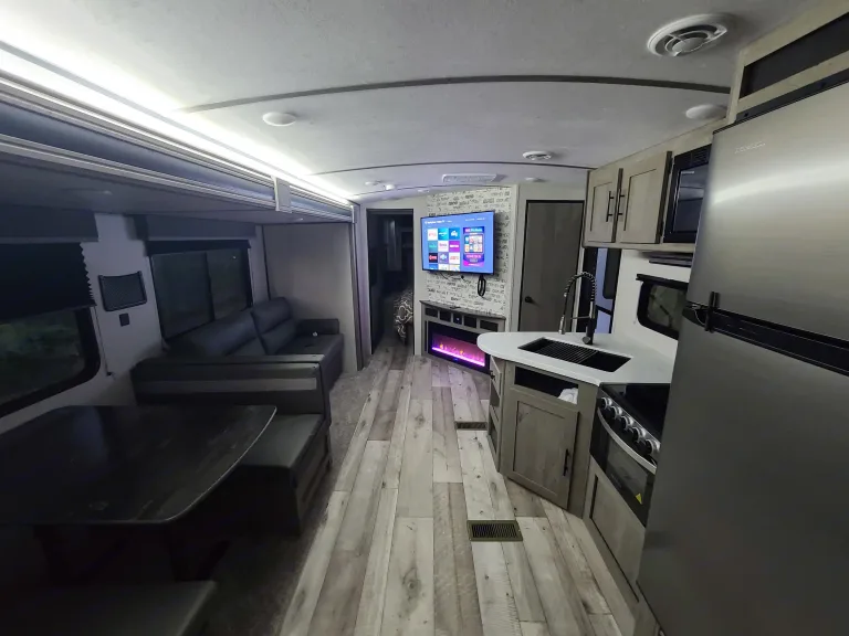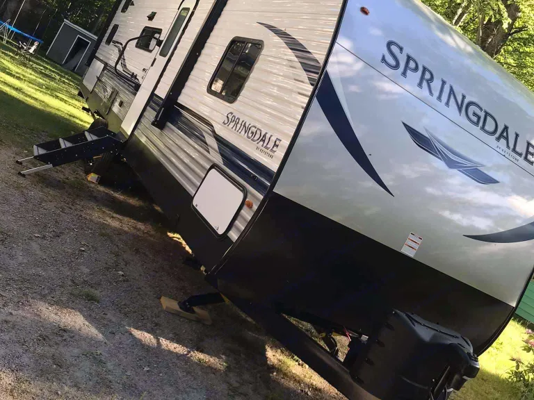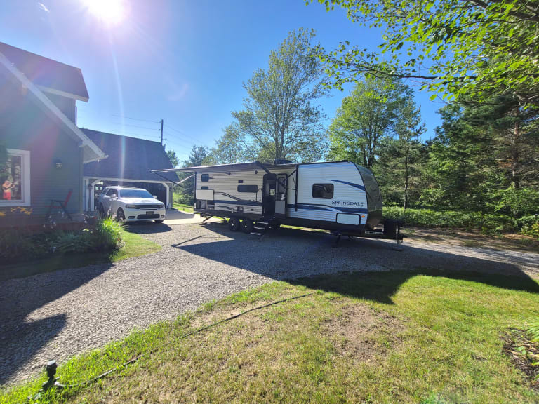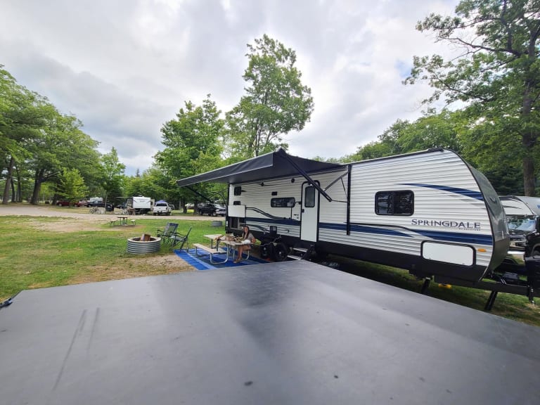 2021 Keystone Springdale. Very spacious. Fold down sofa, fold down dinette for sleeping, bunk bed in rear and a queen bed in the front. Spacious bathroom with walk in shower. 10 cu ft. refrigerator. Gas stove top and oven inside as well as a 2 burner gas stove top outside. Mini fridge outside as well. Garbage and Can trash cans. 21 ft. power awning! Electric fireplace for those chillier nights, as well as gas furnace.There are many add ons available so be sure to check that out!!This unit has the arctic package for those that want to do fall camping. We will keep this unit available until the first snow flies. If weather is too cold for water, we will have to turn water supply off, but camper could still be used for a discounted fee.*If delivery is over 50 miles please contact myself for more information. What's includedCamping chairs, campsite rug, 2 outside garbage cans, towels and utensils. Has pots and pans. Bring your own bedding please. RecommendationsEnjoy any campgrounds in the area! Otsego state park, Higgins lake state park, Petoskey state park, Young State Park. This will keep you very comfortable! Other things to noteNo smoking, if smoking is suspected a $250 fee will be charged.