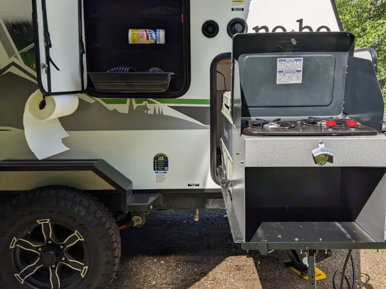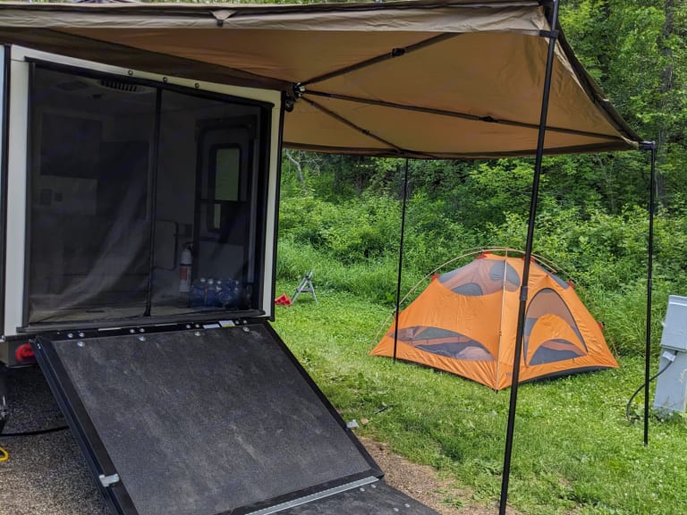 • Batwing awning that wraps around two sides of the camper