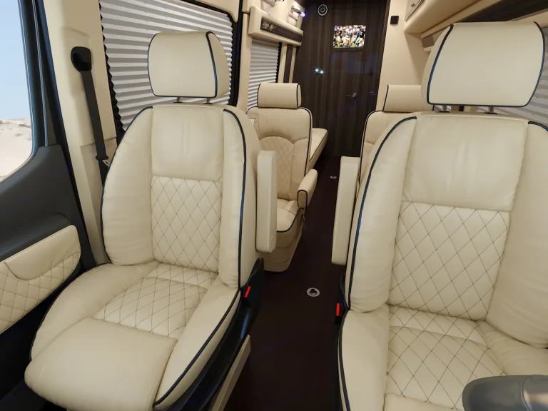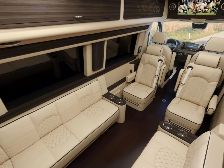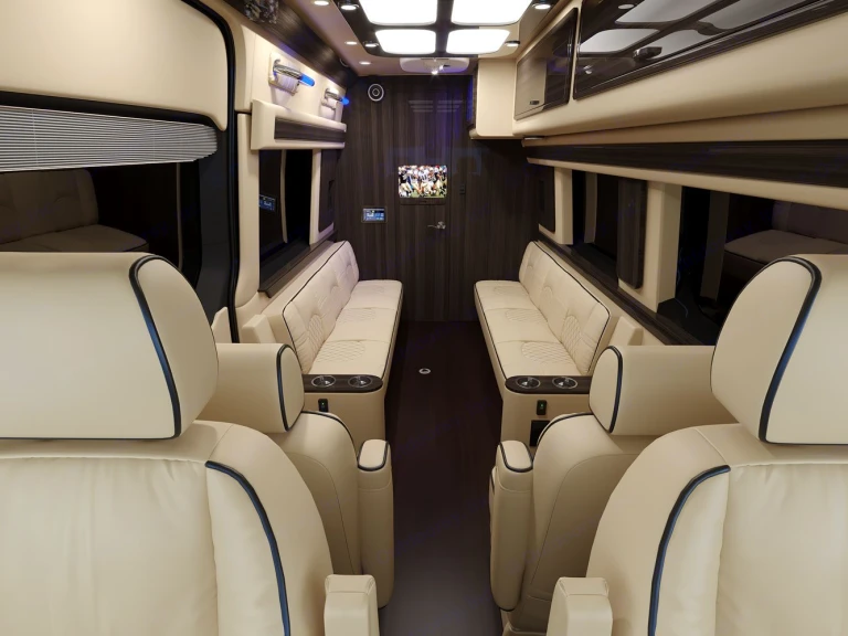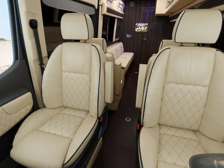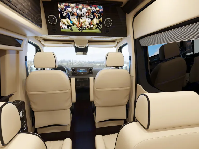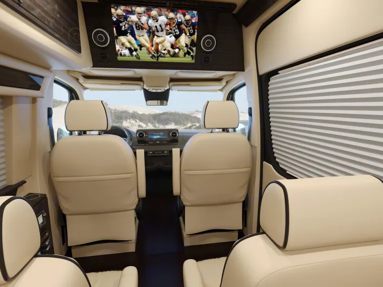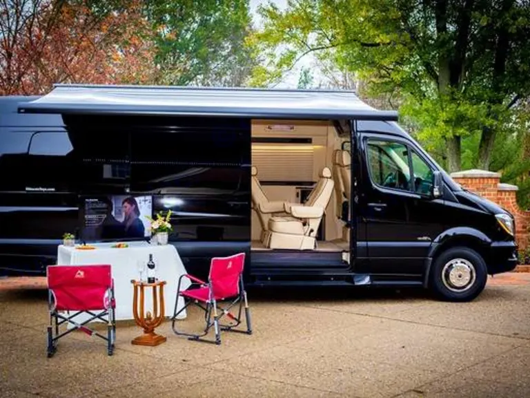 The Ultimate RV is the only luxury Sprinter on the market with a rear bathroom, comfortably seating up to 10 people and offering the functionality needed for camping…and more. Now, you can experience our distinctive luxury, class and style for long road trips, entertaining, sporting events, away games and family vacations. Making this the perfect RV, ultimate family van and go-to entertainment vehicle in one.Designed for top comfort in both travel and entertaining, you’ll enjoy nothing but the best—a complete galley and full rear bathroom (see below for more on this), lighted bar cabinet, four plush captain’s chairs that swivel 180º and two comfortable sofas that quickly fold down into a nearly queen-size bed. There are three distinct heating/AC systems, wireless internet, Apple TV and you can watch your favorite movies, live TV, sports or play video games on two built-in HD TVs.The fun and relaxation extend outside with a power awning that opens at a push of a button and a built-in tailgating package for easily setting up a large screen TV.