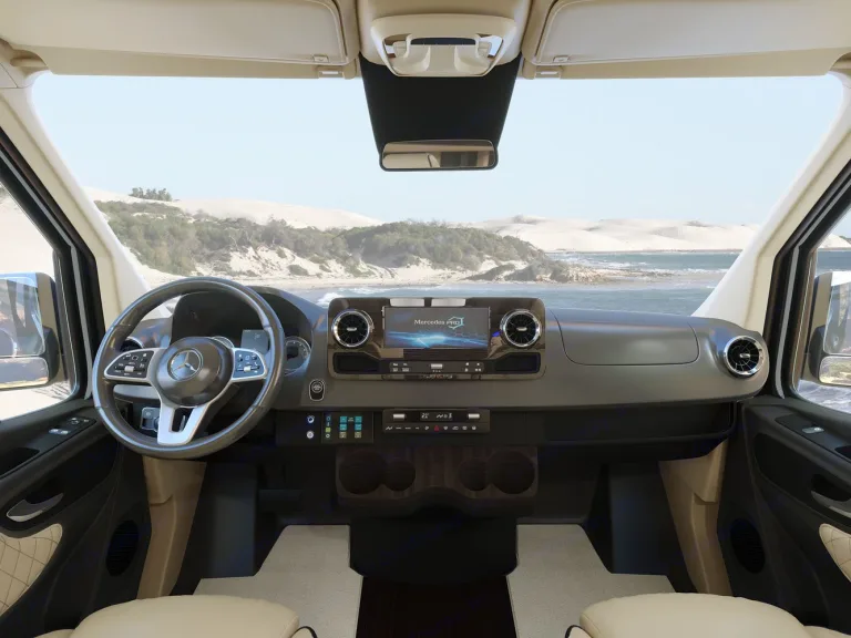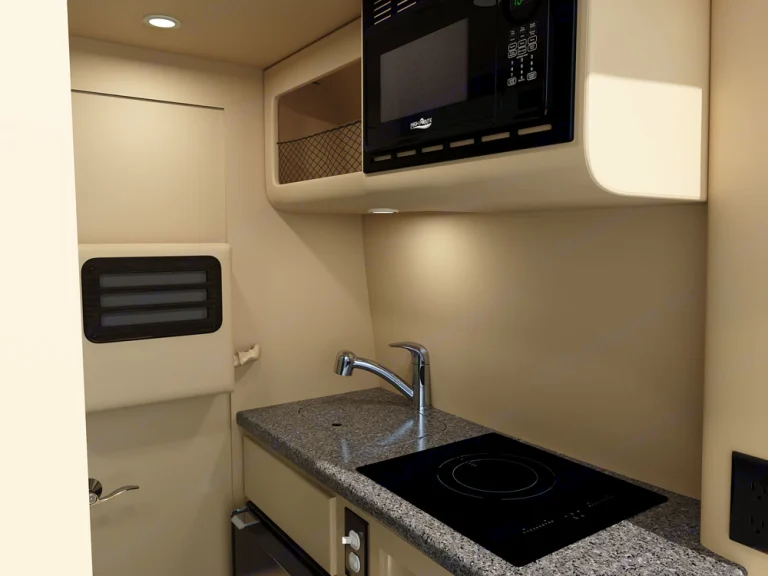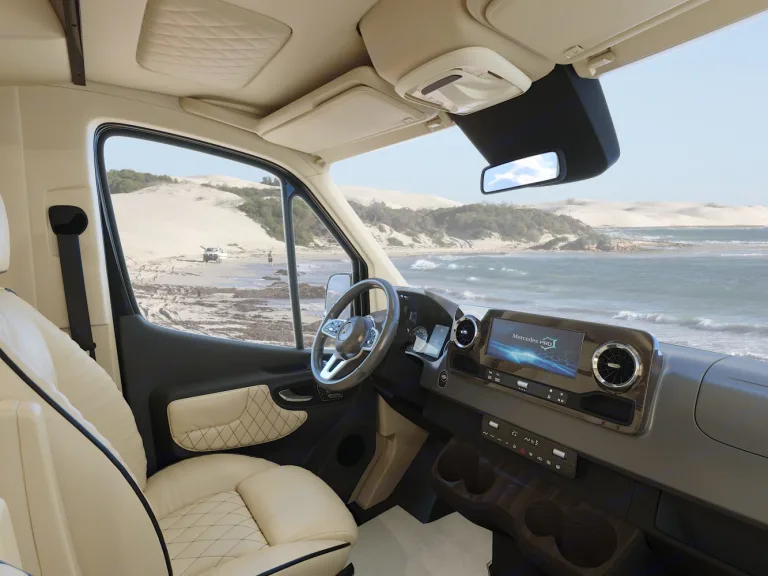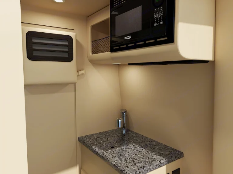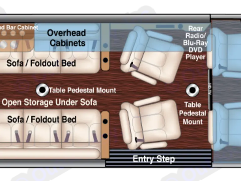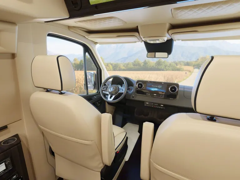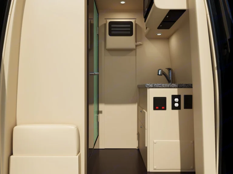 The Ultimate RV is the only luxury Sprinter on the market with a rear bathroom, comfortably seating up to 10 people and offering the functionality needed for camping…and more. Now, you can experience our distinctive luxury, class and style for long road trips, entertaining, sporting events, away games and family vacations. Making this the perfect RV, ultimate family van and go-to entertainment vehicle in one.Designed for top comfort in both travel and entertaining, you’ll enjoy nothing but the best—a complete galley and full rear bathroom (see below for more on this), lighted bar cabinet, four plush captain’s chairs that swivel 180º and two comfortable sofas that quickly fold down into a nearly queen-size bed. There are three distinct heating/AC systems, wireless internet, Apple TV and you can watch your favorite movies, live TV, sports or play video games on two built-in HD TVs.The fun and relaxation extend outside with a power awning that opens at a push of a button and a built-in tailgating package for easily setting up a large screen TV.