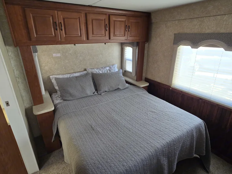 The over cab bunk has been renovated and now has an oversized king bed capable of sleeping 2 adults or several kids. Kids Love this area as it provides a quiet, secluded space for reading, playing on a tablet, or watching TV. The privacy curtain can also be drawn closed for additional seclusion and to drown out noise. This area is accessed using a new, steel ladder which hooks securely to the edge of the bed. When not in use, the ladder can be stowed on the bed (along
