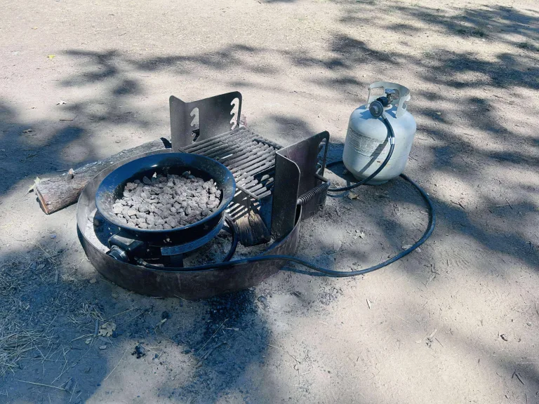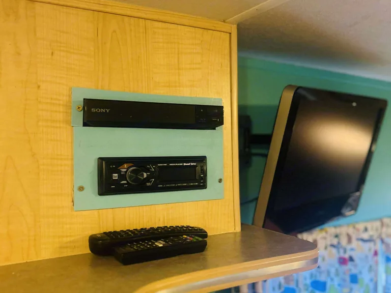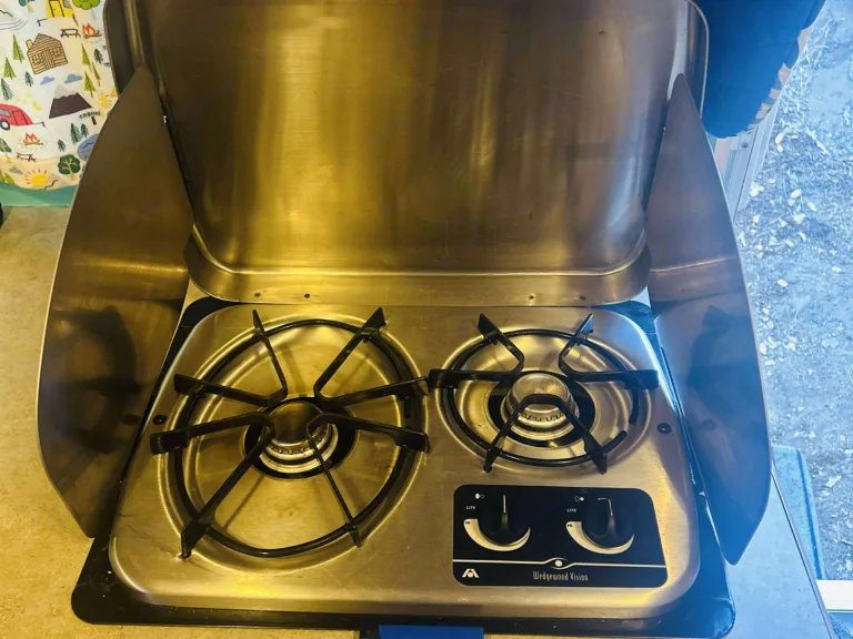 Has a 2 burner propane stove, Fridge/Freezer, Shower, Hot Water, AC Cooling as well as Heating and DVD/Blu Ray Player & TV.What's included• We will include many of your Camping necessities such as a Portable BBQ Grill, Coffee Maker + Creamer, Tea, Electric Kettle, Plates, Bowls, All Cutlery, Pots, Pans, Can Opener, Lanterns, Bath Towels, Shampoo & Conditioner, Dish Scrubby & Soap, TP, Paper Towels, 10x10 Canopy, 4 Camp Chairs, Large Camping Rug, Board/Card Games, Marshmallow Sticks.