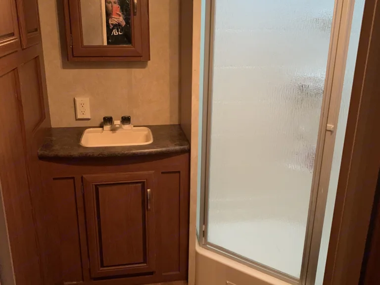This pull behind camper comes with fold out chairs, pop up canopy, outdoor mats and also an outdoor kitchen (including outdoor refrigerator and sink)