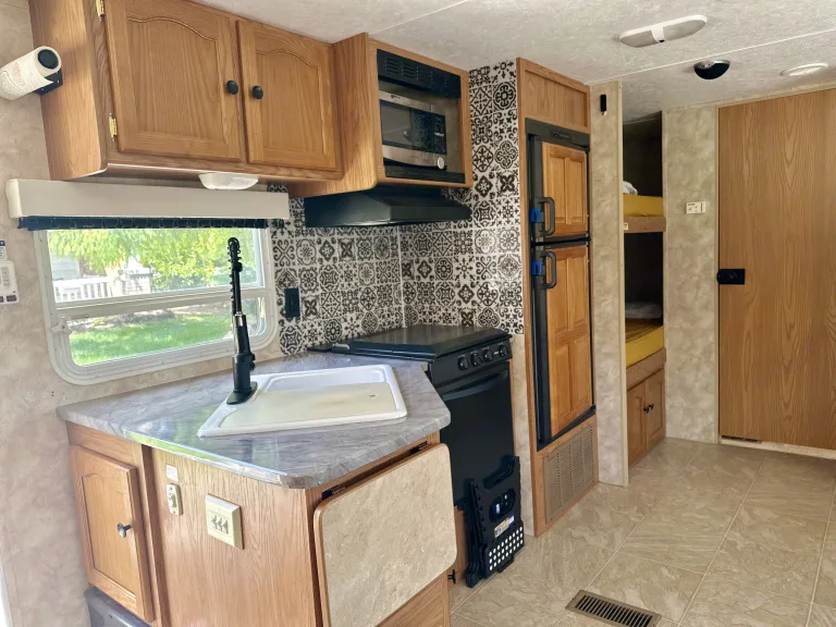 This girl is ready for fun! Bring your family - young and old. Sleeps 4-6 very comfortably with a fold out couch that easily puts away. Room for pack n play as well. Meticulously kept clean. This tows easily and is very sturdy. New toilet, kitchen sink filtration system (wash your dishes without worry!), updated AC, new (only used a handful of times with protective cover) twin mattresses, and more! Start exploring today with this fun trailer! Great for seasoned and new campers alike!What's included• Plates